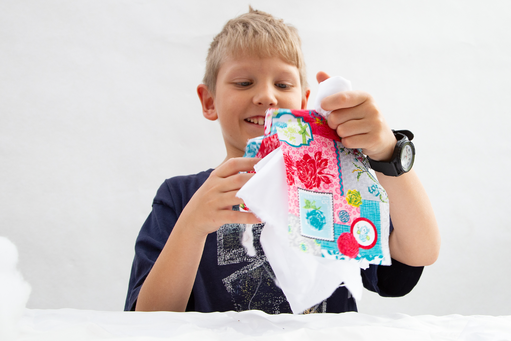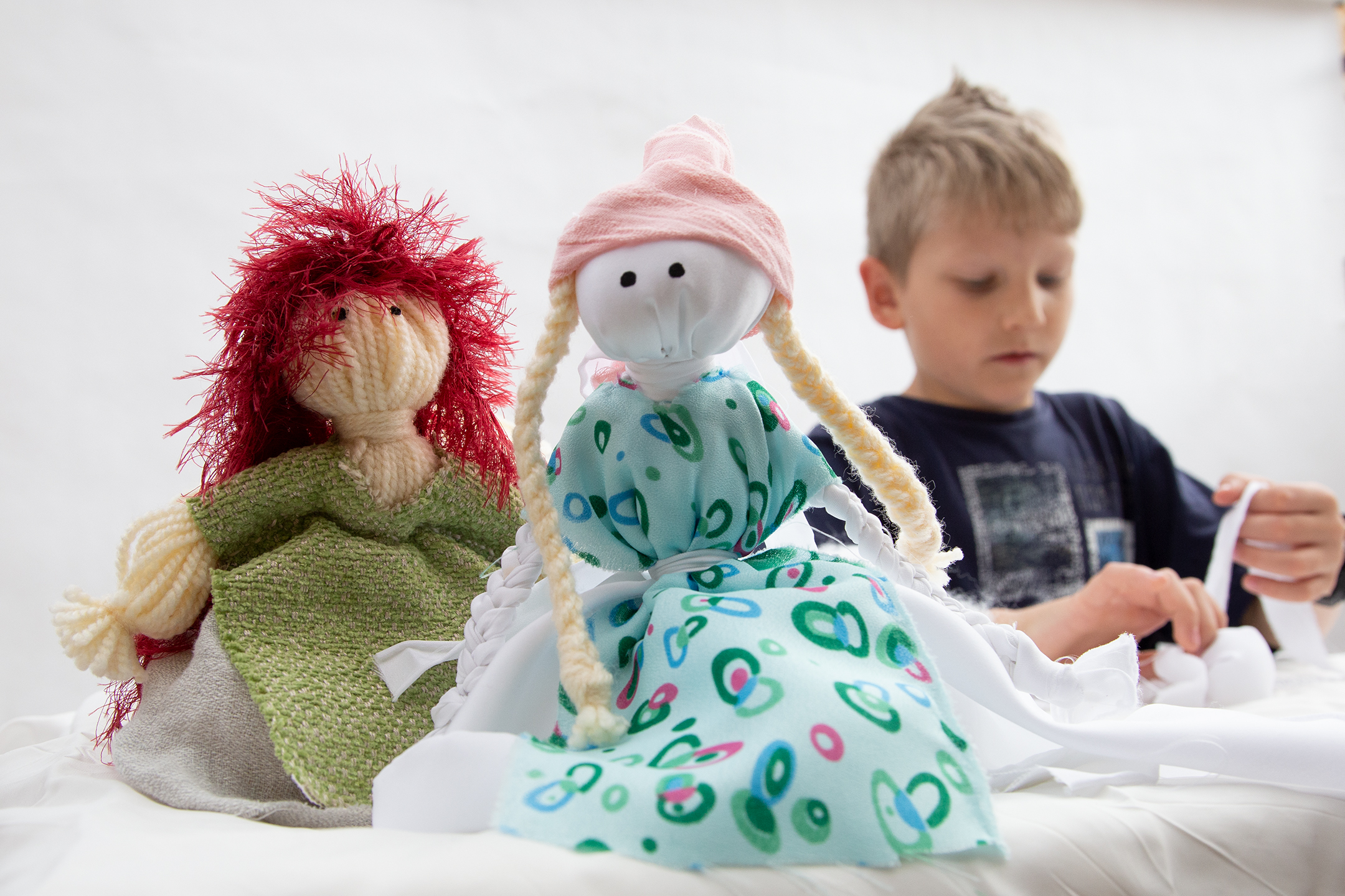 Rasch wird klar, wie wir mit Kindern ganz einfache Puppen machen werden, idealerweise ohne Nähmaschine, dafür viel Geknüpftes, Gefaltetes, Gerissenes und vor allem Einfaches. Mit Stöckchen, Ästchen, viel upgecycelten Stoffen und Wolle und vielleicht dem einen oder anderen Socken. Und selbstverständlich mit allen menschlichen Hautfarben dieser Welt. Michel möchte bis übermorgen einen Text und – Fotos. Sami, unser großzügiger Jüngster, der sich noch gern vor der Kamera bewegt, beweist mir mit seinen neun Jahren, dass es leicht möglich ist, so eine Ragdoll mit Kindern herzustellen. Ich zeige es vor, er macht es nach. Geschickt wie immer. Wenn Sami will, dann kann er seine Hände ganz gezielt einsetzen. Und Puppen machen will er. Er bedankt sich auch noch überschwänglich, dass ich ihm gezeigt habe, wie einfach es ist, eine Puppe herzustellen. Und er erzählt mir mit leuchtenden Augen von einem Mittelalterbuch, in dem er auch schon einen Text über Lumpenpuppen gelesen hat. Oder war es im Indianerbuch? Oder überhaupt im Schulheftchen? Auf jeden Fall sagt ihm der Begriff „Lumpenpuppe“ ganz viel.