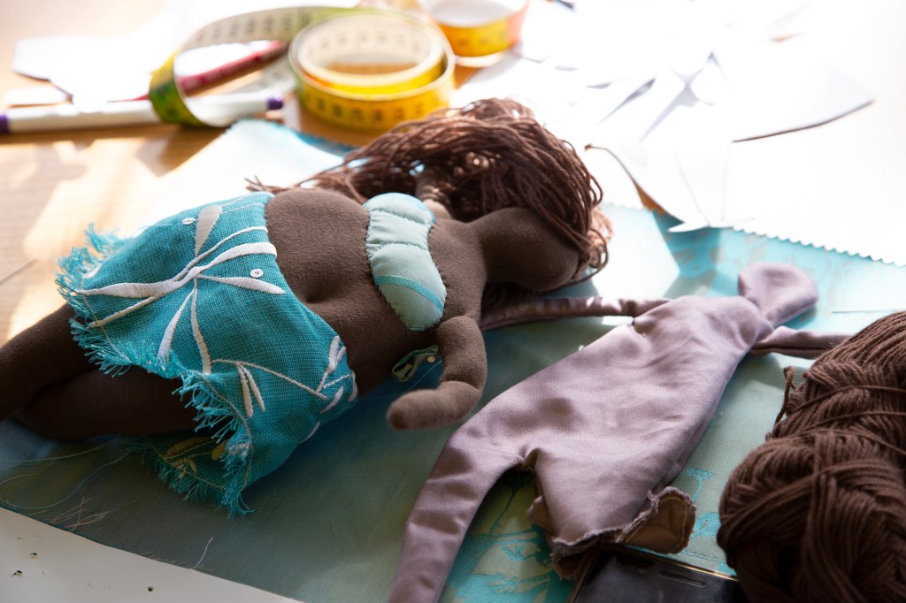 Bei mir führt all das Lernen und Forschen und Lesen dazu, dass ich noch einmal von vorne beginne. Ich beginne noch einmal bei den einfachsten Umrissformen. Es braucht so wenig, um menschenähnliche und manchmal archaische Wesen zu machen. Ich löse mich von schönen Schnitten, zeichne mir auf, was ich mir vorstelle. All die Themen aus unserer heilsamen „Body Positivity“-Frauengruppe inspirieren mich. Ebenso die eine geliebte Freundin, die wie eine Göttin tanzt, wenn sie sich den Raum dafür nimmt. Beim Tun entstehen sofort neue Ideen. Wie sehr es mir jetzt zugute kommt, dass ich wunderschöne alte Kleidungsstücke, Innenraumstoffmuster und all das andere Klimbim sortiert und aufbewahrt habe. Heute beim Aneinandernähen meiner ersten einfachen Skulptur spüre ich sie wieder: reine Freude gluckst bauchaufwärts, nimmt mir fast die Luft zum Atmen, löst unkontrollierbares Herzklopfen aus. Es ist reine Lust am Tun aus mir heraus. Eine Überdosis Glück. Nebenwirkungsfrei.