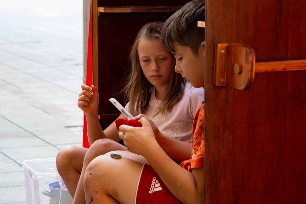 Morgen Freitag und am Samstag um jeweils zehn Uhr sind wir mit unseren Abschlussaufführungen in der Innenstadt unterwegs. Wir haben unsere Standorte in den Schatten verlegt, es zahlt sich aus, gleich bei der ersten Station vor der Werkstatt dabei zu sein. Sitzgelegenheiten nicht vergessen, und vielleicht einen Sonnenschirm. Die Kinder sind bestmöglich vorbereitet und motiviert. Wir Erwachsene feiern bereits heute, dass alle Kinder unersetzliche Teile des Projektes geworden sind. Das war unsere Intention – dieses Ausschöpfen ihrer vielseitigen kreativen Möglichkeiten. Möge die Gesundheitsfee mit uns sein und ihnen morgen die Bühne geben, die sie verdienen. Und möge die eine oder andere Wolke uns vor allzu heißer Sonne schützen.