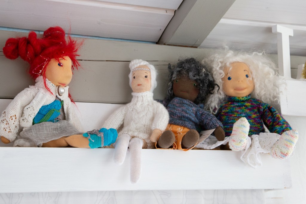 „Einfach weitermachen, bitte, mach einfach weiter“, flüstert mir die Elfenkönigin auf meinem Schoß zu. Ja, sie ist vollkommen zufrieden, dass die Haare jetzt nicht mehr weiß und rosa sind. Sondern rosa und weich und füllig. Strähnchenweise heller und dunkler. Und ja, Stirnfransen könnten gut ausschauen, lässt sie mich wissen. Und diese Silberdrahtohrkostbarkeiten, die sie mir seit gestern einflüstert. Und sie möchte dann endlich Arme bekommen, beweglich, wie schon die Beine. Und hach, der Mantel. Die luftige Kleidung. Eine Schaukel. Und ein Geheimnis. So viel, worauf wir uns beide freuen.