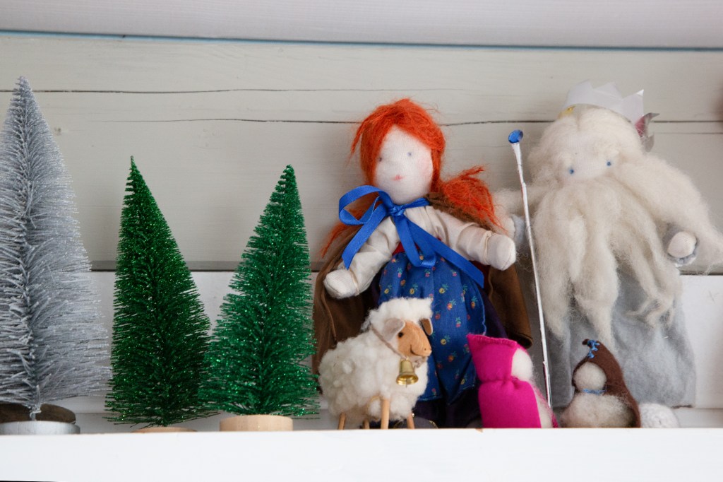 „Ist der Winter und Weihnachten bald vorbei?“ wispert die Wolfsfrau zu Frau Herbst, die neben König Winter und dem Glöckchenschaf steht. Frau Herbst und Herr König haben schon etwa zehn Jahre am Buckel. Standen Jahr für Jahr in der vorweihnachtlichen Krippe für die heranwachsenden Kinder. Beide nicken weise. Die Schafsglocke klingelt. Frau Wolf wundert sich ein bisschen über die Glitzerbäume, die ihr seit ein paar Wochen vor der Nase stehen. Sie genießt die Wärme des Ofens an ihrem luftigen Platz, meldet sich selten zu Wort. Ruht in sich. So eine gute Seele. Sie beobachtet viel und schaut. Sie ist einfach da, braucht uns alle nicht. Ich bin es, die froh ist, dass ich sie da oben spüre.