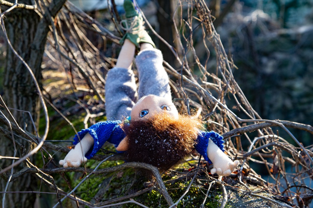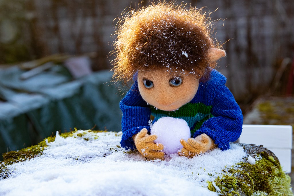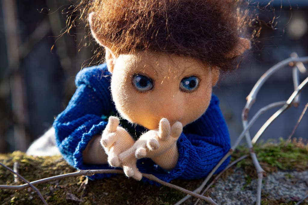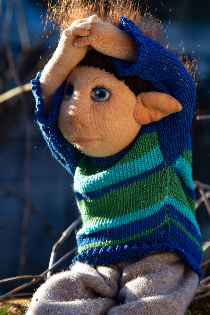 Vorerst wandert Finn einmal in den Klagenfurter Gemeinwohlladen zu Ingun und ihrem genialen Team. So schön zu erleben, wie meine Wesen dort willkommen geheißen und wertgeschätzt werden. Da streicht ihnen mal wer über den Kopf. Werden sie herum getragen und her gezeigt. An ihm gibt’s schon ein paar Sachen zu bestaunen. Die extra coolen gestreiften Schuhsohlen beispielsweise, Ton in Ton mit dem handgestrickten Pullover. Die spitzen Elfenohren, seine voll beweglichen Arme und Beine. Und den Blumenstrauß, den er direkt für den heurigen Valentinstag mitbringt. Mal sehen, wer ihn bekommt!