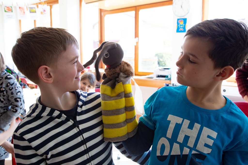 „Ist das die Sumsi?“ „Nein, das ist doch die Maja!“ „Aber geh, das ist der Willi!“ Ich sitze in einer lebendigen, aufgeregten Kinderschar von Acht- und Neunjährigen. Wir diskutieren, ob Bienen Nester bauen wie die Wespen. Ob beim Puppentheater Schauspieler sichtbar sind oder sich verstecken müssen. Ob Musik und Tanz dazu gehört. Oder nicht. Ich höre viele Geschichten von Bienen- und Wespenstichen. Und dass sie, die Bienen, „das Gelbe aus den Blumen holen“. Tja, lieber Egon. Nächste Woche bist du als Bienenexperte für Wildbienen dran, dir von uns allen Löcher in den Bauch fragen zu lassen. Und vielleicht finden wir auch einen Bienennamen, der zu unserer (Wild)Biene an meiner Hand passt.