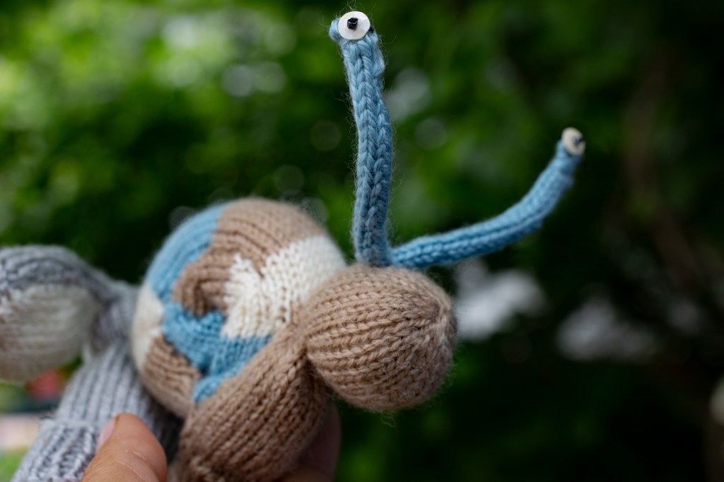 Und tja, ein paar Wochen später – hier sind sie. Meine ersten gestrickten, behäkelten und bestickten I-Dolls erblicken täglich das Licht dieser Welt. Sie sind für Erwachsenenhände gemacht. Unter Aufsicht können sie bestimmt auch von Kindern bespielt werden. Ich habe extra unten ein Bündchen angestrickt, das man umschlagen kann, um die Puppe zu verkleinern. Sie sind bewusst einfach gehalten. Vieles ist angedeutet, manches dafür mit Genuss und ohne auf meine Zeit zu achten, aufwändig bestickt. Ich sage nur Libelle. Meine Libelle muss funkeln. Sonst ist es keine Libelle. Gestrickte Libellen funkeln nur mit schimmernden Glasperlen. Diese Fingerpüppchen „passieren“ wie nebenbei. Ganz ohne Schnitt und Anleitung, einfach so. Das ganze Stricken geht wie nebenbei. Beim Lesen. Beim Film. Beim Reden. Ich brauche etwa zwei Abende oder zwei Terrassenbesuche einer Freund*in für eines dieser Wesen. Weißt du eigentlich, dass beidhändiges Arbeiten beide Hirnhälften aktiviert und dabei kreative Prozesse ablaufen? Also – ich breche hiermit eine weitere Lanze fürs beidhändige Arbeiten sprich stricken! Es macht mir zunehmend Freude. Bis auf die Größe wird jedes Wesen ein bisschen anders. Du kennst mich ja. Zwei Mal das Gleiche langweilt mich. Die Fingerpüppchen sind Unikate, die jedes Mal geringfügig anders ausschauen werden. Vieles kommt aus dem Pflanzen- und Naturreich. Und ganz oft steht eine Emotion dahinter. Bei der Häsin beispielsweise, die schüchtern lispelt. Ganz im Gegensatz zur Blume, die jedem erzählt, wie toll sie diesen frühen Sommer findet. Und die schielende Schnecke, die von ihrer Schönheit ganz begeistert ist.