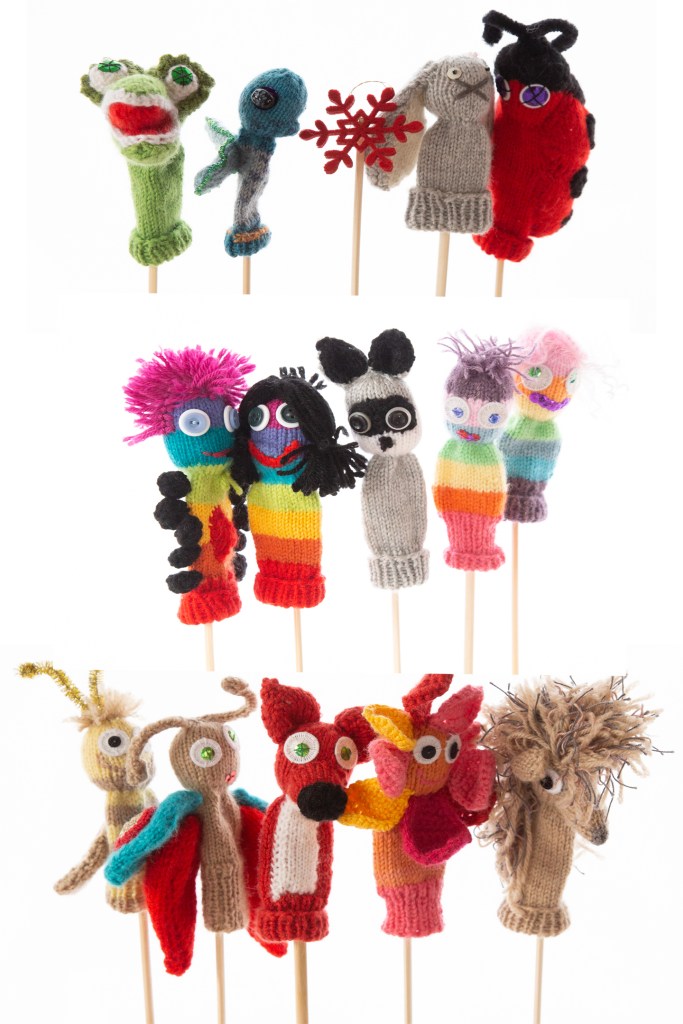 Noch einmal tauchen sie heuer auf, die bunten und verrückten und liebenswerten Fingerpuppen, die im ersten Lockdown entstanden sind. Ohne jede Anleitung, von Kopf bis Fuß oder von unten nach oben gestrickt, ganz wie es mir einfiel. Sie passen genauso gut auf Erwachsenenfinger wie auf kleinere Hände, weil sie unten umgekrempelt werden können. Achtung, Nebenwirkung: Sie zaubern ein Lächeln in (fast) alle Gesichter und könnten Gespräche beginnen!