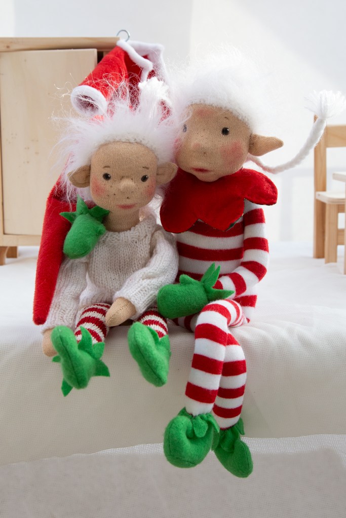 Weihnachtselfen sind ausgesprochene Schlingel. Und hocken gerne in Regalen. Friedolin ist der links. Sein roter Mantel hängt am Kasten, weil er wie verrückt eingeheizt hat und sonst zerronnen wäre. Pamino (rechts) versucht mit allen Tricks heraus zu finden, warum Friedolin vom Weihnachtsmann absolutundvollkommen totales Einheizverbot bekommen hat. Für alle vier Weihnachtswochen. Und jetzt die kleinen Holzfiguren abschleifen muss, die ein anderer Wichtel vorbereitet hat.