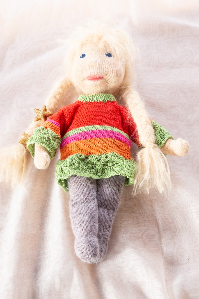 Dieses Mädchen ist eine der letzten von drei Puppen, die ich für Kinder gemacht habe. Damals, vor zwei Jahren, als ich noch dachte, ich werde Puppenmacherin für Kinder. Sie erinnert mich ein bisschen an mich selbst, als ich noch ein sehr kleines Mädchen mit sehr langen Zöpfen war, das auf seinem Fahrrad durch den Park flitzte. Die Farben des handgestrickten Pullovers sind immer noch meine Lieblingsfarben. Ich sag nur #bougainvillea. In diesen Farben könnte ich baden.