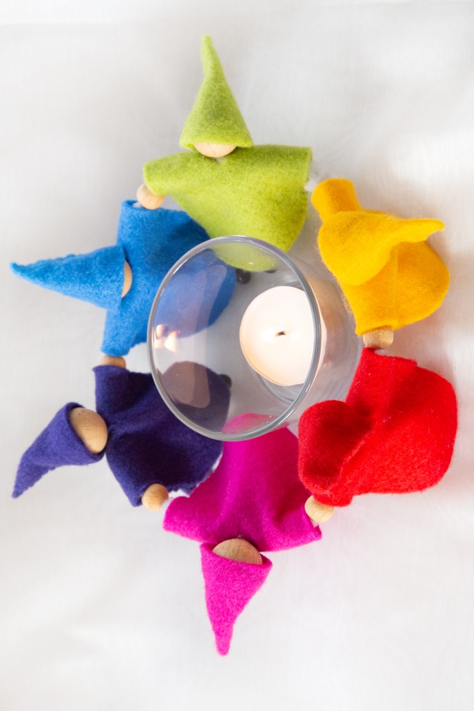 Als eine Freundin mir in meinen Anfängen mit all den Minizwergen einen Auftrag für ihre Regenbogenzwerge gab, stellte ich auch einen Reigen mit diesen Wesen her. Auch Regenbogenzwerge tanzen um ein kleines Feuer, gerade zu dieser Jahreszeit.