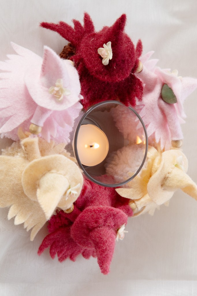 Dieser Reigen in Altrosa mit den Elfen der Winterrosen passt so gut in die Adventzeit. Sie haben bei mir bis heute ihre schützenden Hände über die Rosen an all meinen Hausmauern gehalten. Nun halten sie einander an den Händen, besprechen kichernd und lachend das alte Jahr, beweinen das Verlorene und heißen das Neue willkommen. Lass dich anstecken von ihrer fraulichen Lebendigkeit, wenn sie um ihr Minifeuer im Glasbehälter tanzen.