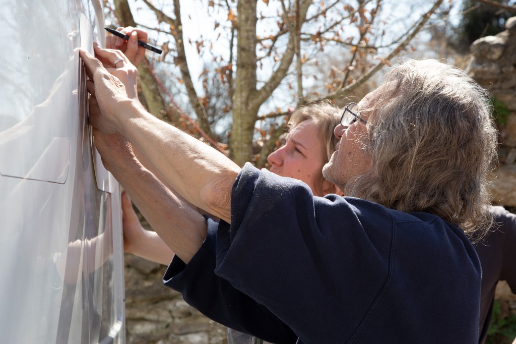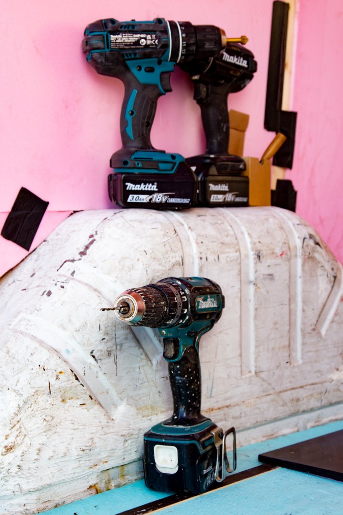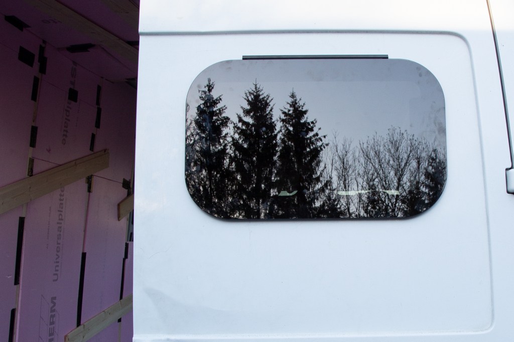 Jetzt sind vor allem meine handwerklichen Fähigkeiten auf der Baustelle gefragt. Eher Kategorie Hilfsarbeiterin. Ich lerne, Buswände zu isolieren. Vorsichtig an der Tischkreissäge zu arbeiten und harte Materialien zu bearbeiten. Die rüttelnde Tischsäge entlang von Linien um Kurven und Ecken zu bewegen. Textiles Material ist wesentlich mitmachbegeisterter. Wildgewordene Klebekartuschen sind vorm Davonquellen zu bewahren. Und Bits und Schraubengrößen, Körner und Japansäge und all die Werkzeuge einer Männerwerkstatt zu finden und intelligent anzuwenden. Wir haben zu zweit staunend gelernt, dass Siebdruckplatten echte Primadonnen sind und vier Arbeitsschritte fordern, um eine Schraube zu montieren. Ohne sie abzureißen. Zwei solche Bodenplatten liegen in diesem Sommer noch vor uns. Die vom Tiny House. Und die vom Zirkuswagen. Und tadaaaa, wir haben es geschafft, innerhalb von fünf Stunden ein kleines Busfenster zu montieren. Selten hat mein Alexander so geflucht. Einer von uns musste die Ruhe bewahren, die Dinger waren teuer und sind ein bissel schade zum Durch-die-Gegend-Pfeffern. Das rechte Klappfenster hat also Platz, passt und wird uns Atemluft herein lassen, wenn wir unterwegs sind. Vielleicht kriegen wir morgen das zweite Fenster flotter in die Hintertür. Ich fürchte mich ein bisschen vorm Dachfenster mit Ventilator. Und ob wir es wasserdicht bekommen.