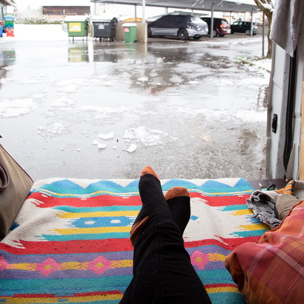 Wir genießen ein covidbedingtes Salzburger Busfrühstück mit Kaffee und Gebäck aus einer Salzburger Bäckerei. Danke liebe Kirche, dass ihr Menschen eure Infrastruktur mit öffentlicher Toilette 24 Stunden anbietet. Die dunklen Wolken am Himmel sind irritierend. Und das Handy sagt uns dann, dass der Winter zurück kommt. Unsere gute Laune trübt kein Tropfen und kein Schneeflöckchen. Wir machen uns auf zu einer Gemeinschaft nach Kärnten, um miteinander eine gemeinsame Zukunft zu planen und zu koordinieren. Als ich am Abend ins Bett krieche, hat es seit Stunden geschüttet. Und wir haben seit Stunden geredet. Ich bin so richtig müde. Unser erstes eingebautes Fenster an der Wagenrückwand hält leider nicht, was wir uns von ihm versprochen hatten. Nämlich den Regen draußen, außerhalb der Buswand. Es rinnt und tropft an der Innenseite herunter. Die Matratze ist nass. Mit Müllsäcken und Klebeband verhindern wir eine Überschwemmung. Wissen allerdings, dass dieses Fenster noch einmal abgedichtet werden muss. Die Nacht ist eisig kalt. Wir Glücklichen sind mit Decken und Schlafsäcken so gut ausgerüstet, dass wir auch das packen. Der morgendliche Anblick von Schnee auf den Bäumen und am Boden ist schockierend. Und dann auch wieder nicht. Aprilwetter eben. Und heuer besonders ausgeprägt. Die Menschen in der Gemeinschaft, die vielen guten Begegnungen und Gespräche machen das bisschen Winter im April wieder wett. Wir dichten die Fugen zwischen Blech und Fenster fein säuberlich mit Gewebeband ab. Und sind dankbar, dass wir beim Einbau des zweiten Fensters schon viel besser wussten, wie es geht. Nicht ein Tropfen Wasser hat sich einen Weg nach innen gesucht.