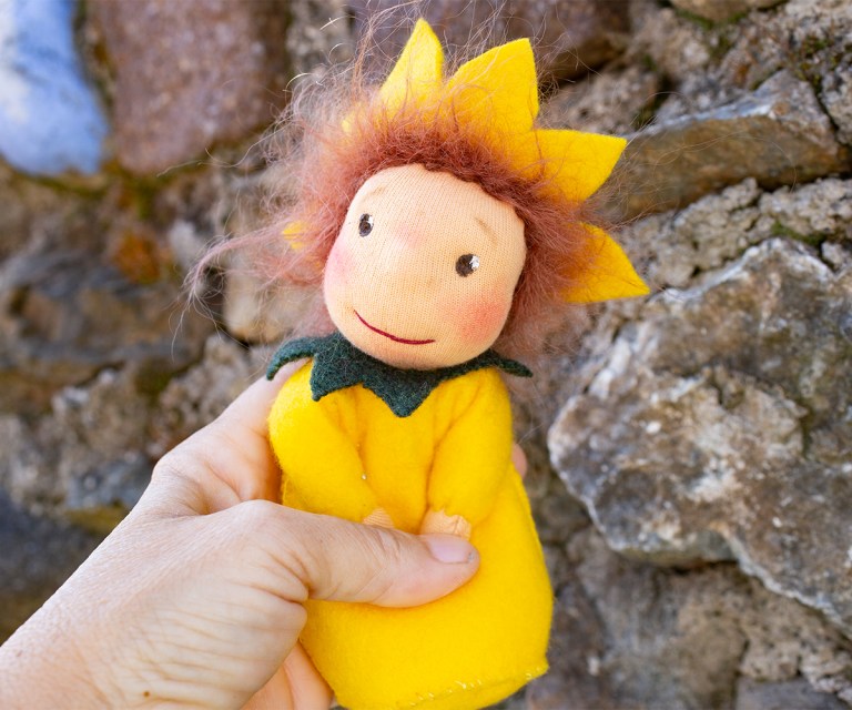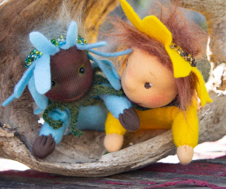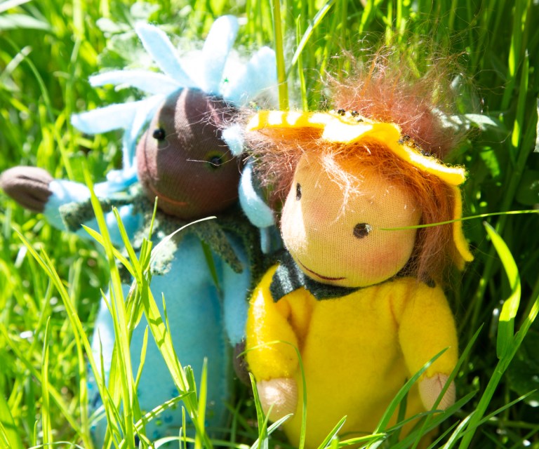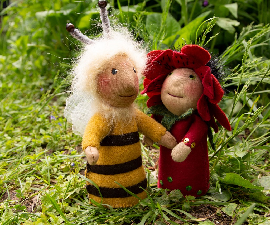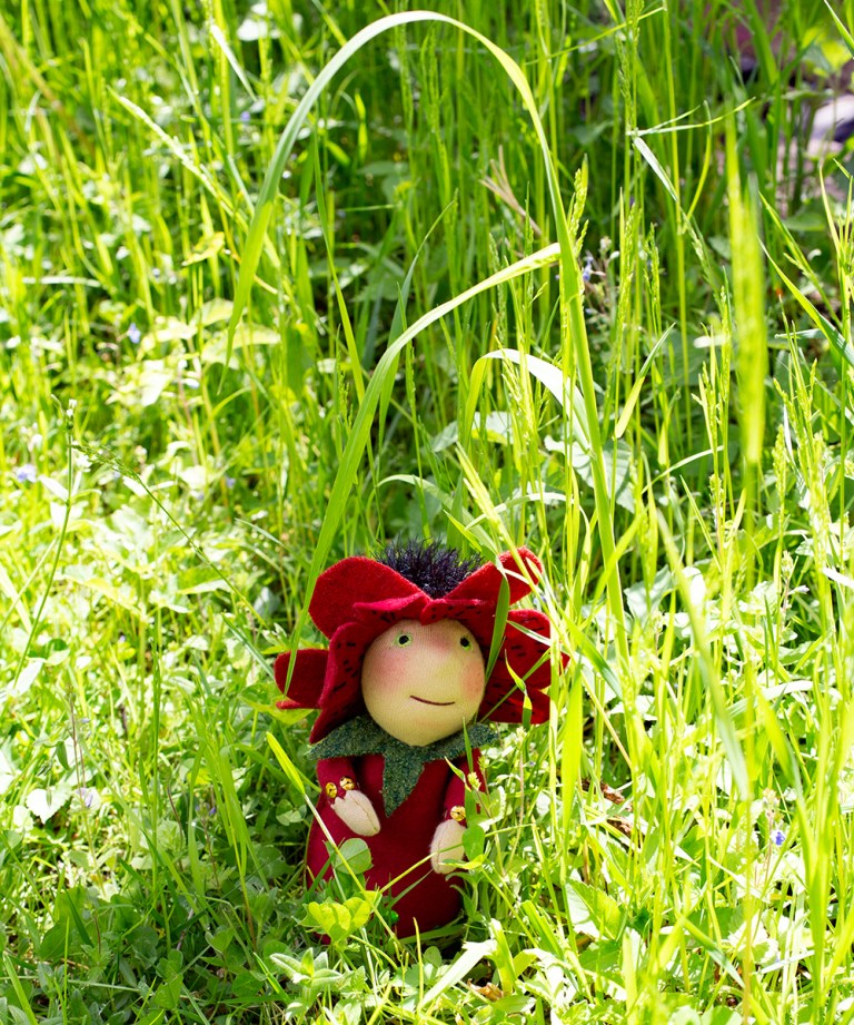 Zwischen Baustelle, filmen und heben und fotografieren will eine Mohnblume in Erscheinung treten. Sie bekommt ein sehr rundes Vollmondgesicht – es war grad Vollmond – und kann sich kaum sattsehen an all den Gräsern, Blüten und Hummeln im Garten. Ich bin sehr gespannt, ob sie auf einem sogenannten Jahreszeitentisch landet. Denn dafür sind diese Püppchen zumindest von meiner Seite gedacht. Kein Kinderspielzeug, sondern kleine Wesen, die die Natur ins Haus bringen. Ich habe es geliebt, meinen Kindern vor allem in der grauen, kalten Jahreszeit theatralische Bühnen mit Frau Herbst und König Winter zu bauen, um sie auf Weihnachten einzustimmen. Gewaltige Äste, mit Tüchern verhüllt und mit Lichterketten bestückt bildeten Höhlen, Hügel und andere Landschaften. Meine Frühlings- und Sommerbotinnen jetzt haben auch das Zeug dazu, in solchen Landschaften zu stehen. Sie sind nur knapp so groß wie meine Hand. Frau Mohn ist mit Kirschkernen gefüllt, die mir vor ein paar Tagen in einem Baumarkt untergekommen sind. Jaaa, es hat sein Gutes, mit dem Liebsten in den Baumarkt zu fahren!