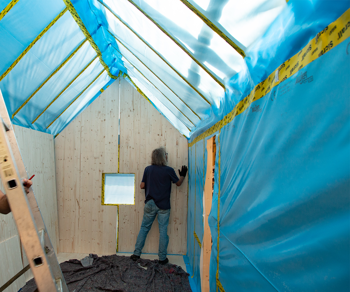 Kaum hört der viele sintflutartige Regen auf, befestigen wir die Dampfsperre an den Innenwänden. So ist das im DIY Bau Prozess.