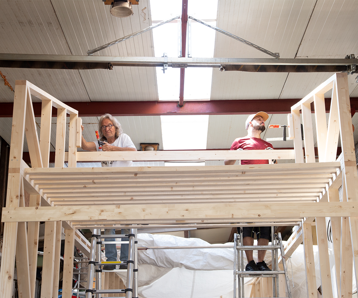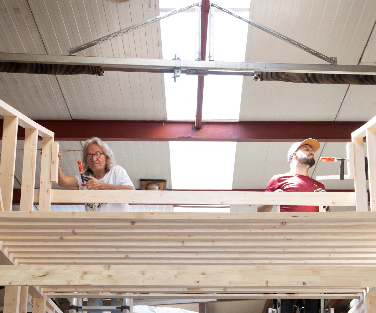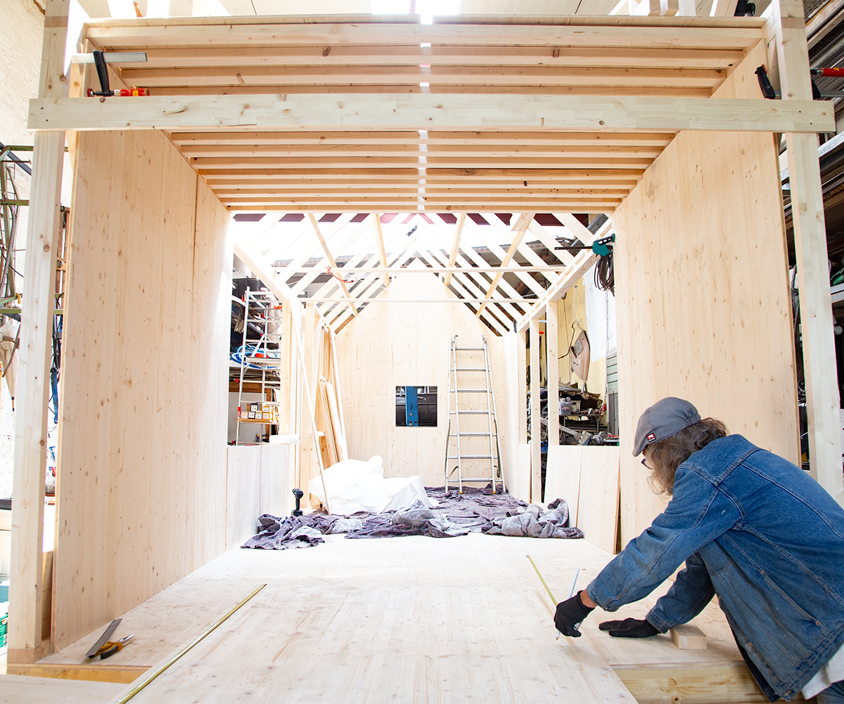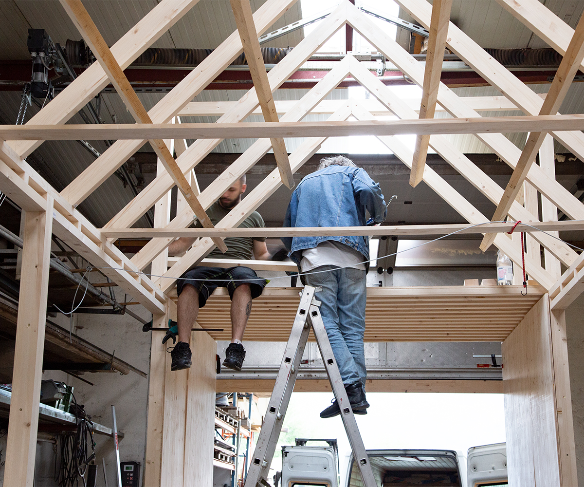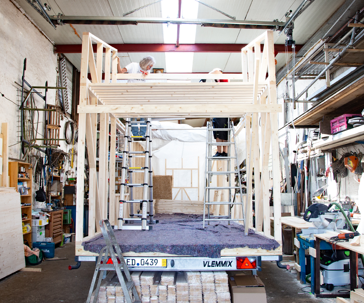 Der Prozess des Bauens hat seine eigene und sehr logische Dynamik. Ich lasse dir einfach Bilder hier, die ein bisschen zeigen, wie wir voran kommen. Wir nähern uns mit Riesenschritten der Fertigstellung von den Wänden und dem Dach des ersten Tiny Houses auf Rädern. Der zweite Trailer wartet schon geduldig vor meinem Atelier, dass er bebaut wird. Wir haben beschlossen, die Gleichenfeier des ersten Daches mit der des zweiten zu verbinden. Vielleicht sogar mit einem kleinen Konzert im kleinen Kreis. Derzeit überfordert jeder weitere und zusätzliche Handgriff das Bauteam rund um Alexander und Andreas. Und mich, die Köchin, Abwäscherin, Haushalt-am-Leben-Erhalterin und Erziehungsbeauftragte. Ehrlicherweise habe ich als Titelbild dieses Mal nicht ein hübsches Entspannungsbild gewählt. Wir stehen unter Hochdruck, wir alle. Zeitlich und mit unseren Ressourcen. Wie wir zwei Traumtänzer, also mein Liebster und ich, glauben konnten, wir hätten das zu zweit bis Herbst geschafft, bleibt ein Rätsel, das wir – der Göttin sei Dank – nicht lösen müssen. Alexander hat die geistige Vorarbeit geleistet, weil er seit November intensiv im Internet geforscht und gelernt hat. Diese Theorie wird jetzt praktisch angewandt, abgeändert und an die Gegebenheiten angepasst. Andreas und sein Mitanpacken ist das größte Geschenk, das uns vom Leben gemacht werden konnte. Er lernt viel. Und wir kommen gut voran, wir drei.