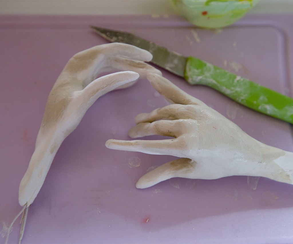 Warum ich überhaupt darüber schreibe? Weil mich all die Tränen, das Nachdenken, das Trauern um einen lieben Menschen und die Reflektion meines ganz privaten Prozesses mit meinem gelebten Alter zurück in meinen künstlerischen Prozess bringt. Danke liebe Freundin auf der anderen Seite. Danke dass du mich erinnerst, dass das Leben endlich ist und gelebt werden will. Dass mir wieder bewusst wird, wie sehr ich diese künstlerische Tätigkeit brauche, um gut auf meine innere Stimme zu hören. Es sind auch die Kinder am Platz, die in mein vorübergehendes Zuhause drängen, weil sie meine Wesen entdeckt haben. Während sie selbstvergessen in ihre Rollenspiele eintauchen, die viel mit sich selbst transformierenden Wesen (!) zu tun haben, mache ich mir endlich wieder die Hände dreckig und forme Hände, die zu meiner Seherin passen. Sie kommt mit in meine Ausstellung im Oktober im Kunstbahnhof in Velden. Oder wandert direkt in den Online-Shop, falls Covid wieder zuschlägt.
