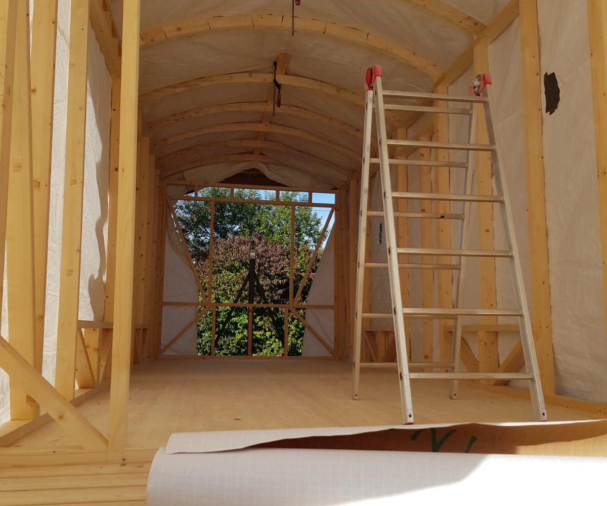 In einem knappen Kilometer Entfernung wächst etwas ganz anderes. Auf einem Trailer aus Metall. Mit viel Holz, Geduld und Liebe und der Ausdauer dieser beiden wundervollen Männer, die schon ein Tinyhouse entstehen ließen. Die Zirkuswagenrundung des Daches nimmt Form an. Die kleine Terrasse ist jetzt schon das Herzstück des langen Kunstwerkes. Bis Ende Oktober sollen wir soweit sein, dass der Zirkuswagen sein endgültiges Dach bekommt. Wetterfest fürs Erste. Mit Fenstern und Türen. Herzklopfen, das kann ich dir sagen. Und während ich diese Zeilen noch einmal durchlese wurde das Haus gerade in die erste Baufolie gehüllt, um nachhaltig Winterkälte, Feuchtigkeit und Taupunkt zu regulieren. Dieses Mal keine Dampfsperre sondern eine Dampfbremse. Wir möchten praktisch wissen, welche Lösung langfristig die bessere ist. Sagen die Männer. Und ich bekomme durch das Schließen der Außenhaut ein erstes Gefühl für mein neues Zuhause.