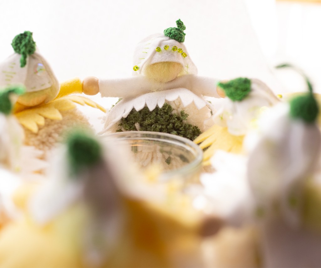 Heuer zu Weihnachten habe ich meinen Heckenrosenreigen mit kleinen rosa Kräuterweiblein auf Woll-Pompon Basis verschenkt. Die Beschenkten erarbeiten sich jetzt ihre eigenen Reigen mit Waldwesen und Elfen. Und mir ist in der Begleitung meiner jungen Nachwuchstalente danach, Schneeglöckchen und Schneerosen zumindest farblich ähnlich zu gestalten und umzusetzen. Miteinander zu arbeiten lehrt so viel besser als daneben zu sitzen und zu dozieren. Der so entstehende frühlingsgrüne Weiber-Zirkel mit sechs Teilnehmerinnen ist nun auf der Suche nach Schneeglöckchenzwiebel, Erde und einem runden Gefäß. Frühling herinnen und draußen. Meine Lieblingsjahreszeit. Selbstverständlich kannst du sie adoptieren und bei dir zu Hause am Tisch tanzen lassen. Melde dich einfach bei mir.