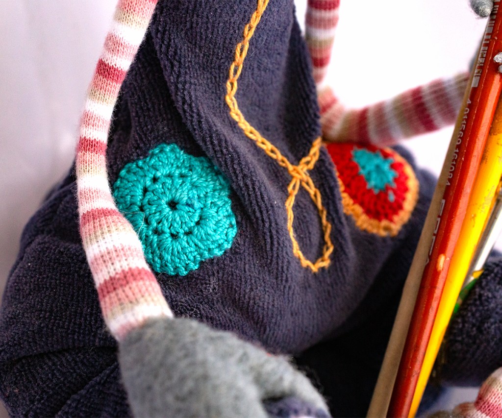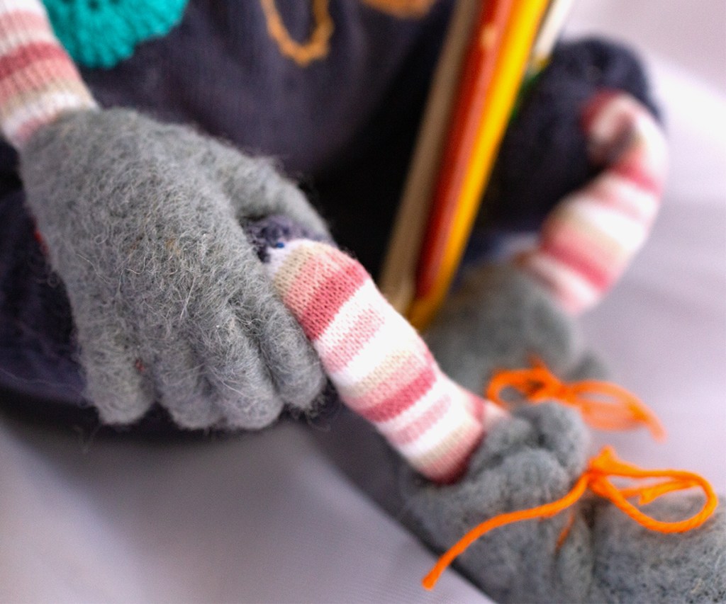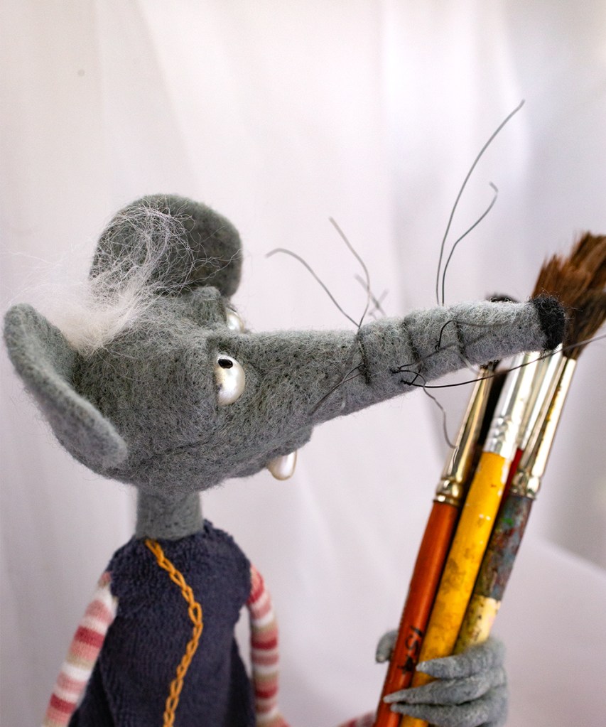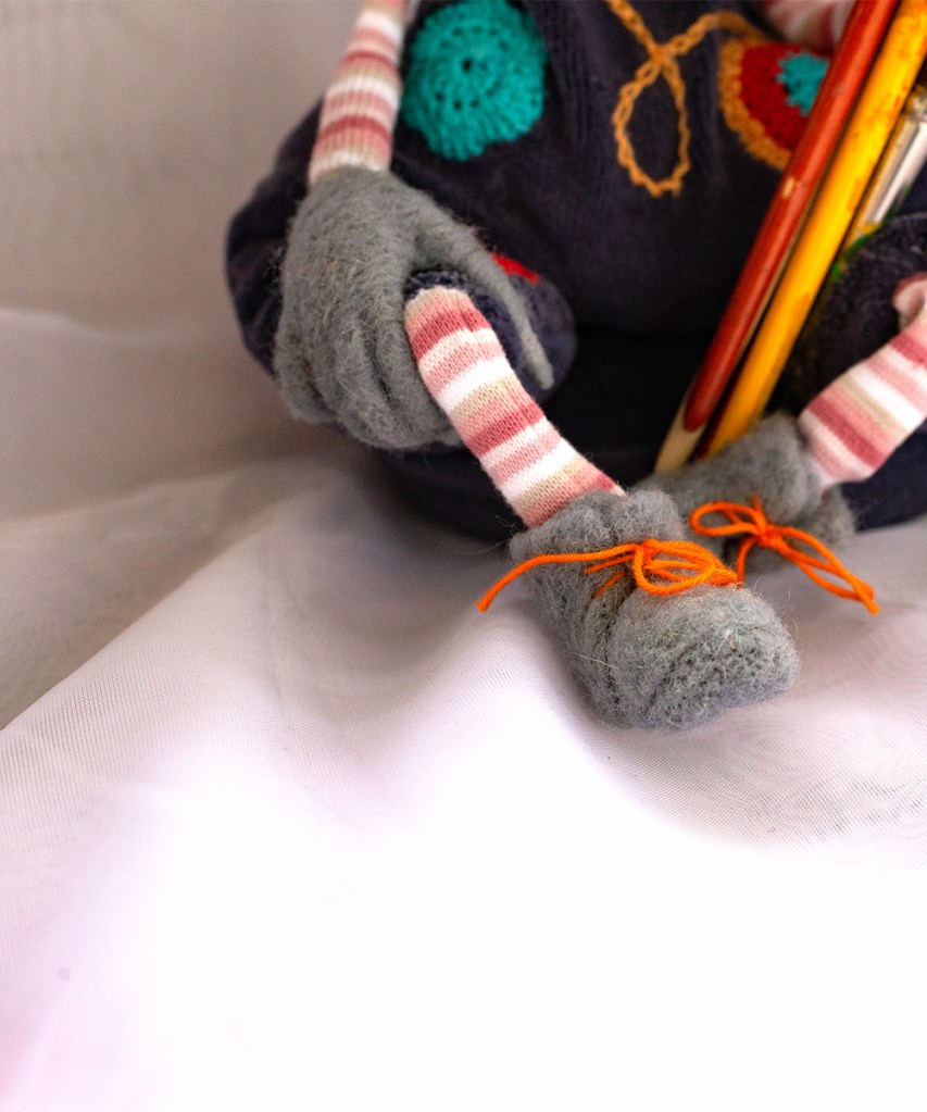 Marianne und ihre Riesenfamilie wird mich heuer vermutlich das ganze Jahr beschäftigen. Dass ich neuerdings auch zeichne hilft mir dabei, Charaktere zu entwerfen. Bewegung zu skizzieren. Ein Wesen von allen Seiten zu studieren. Ich verwende bei der Herstellung dieser textilen Wesen samtene, weiche Kleidungsstücke aus dem Second Hand Bereich. In allen Farben, die mir in die Hände fallen. Die Kleidung meiner Sitzratten ist bestickt und behäkelt. Mal glitzert sie mehr. Mal ist sie nüchtern und simpel. Ganz wie Frau oder Herr Ratte es mir es ins Ohr flüstert. Kopf, Füße und Hände sind handgefilzt und bleiben mit einer eingebauten Armatur beweglich. Ich übe und übe und die Gliedmaßen gelingen mir zusehends besser. Meine Sitzratten sind Gefühlswesen. Marianne ist eine neugierige, wissbegierige und mutige Ratte. Es gibt aber auch die zaghaften, die traurigen oder die euphorischen. Lass dich überraschen. Was ich noch unbedingt loswerden möchte: meine Wesen sind ganz selten für Kinder geeignet. Sie haben verschluckbare Kleinteile oder wie hier Marianne gedrahtete Schnurbarthaare. Gut zum Anschauen, weniger gut zum Kuscheln. Unsere inneren Kinder freuen sich umso mehr, wenn sie ihr begegnen…