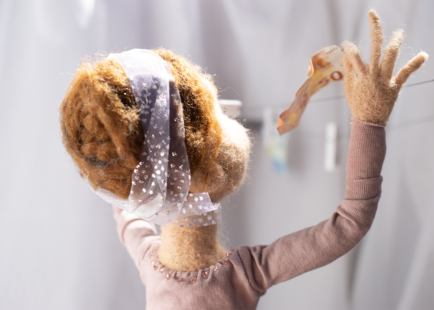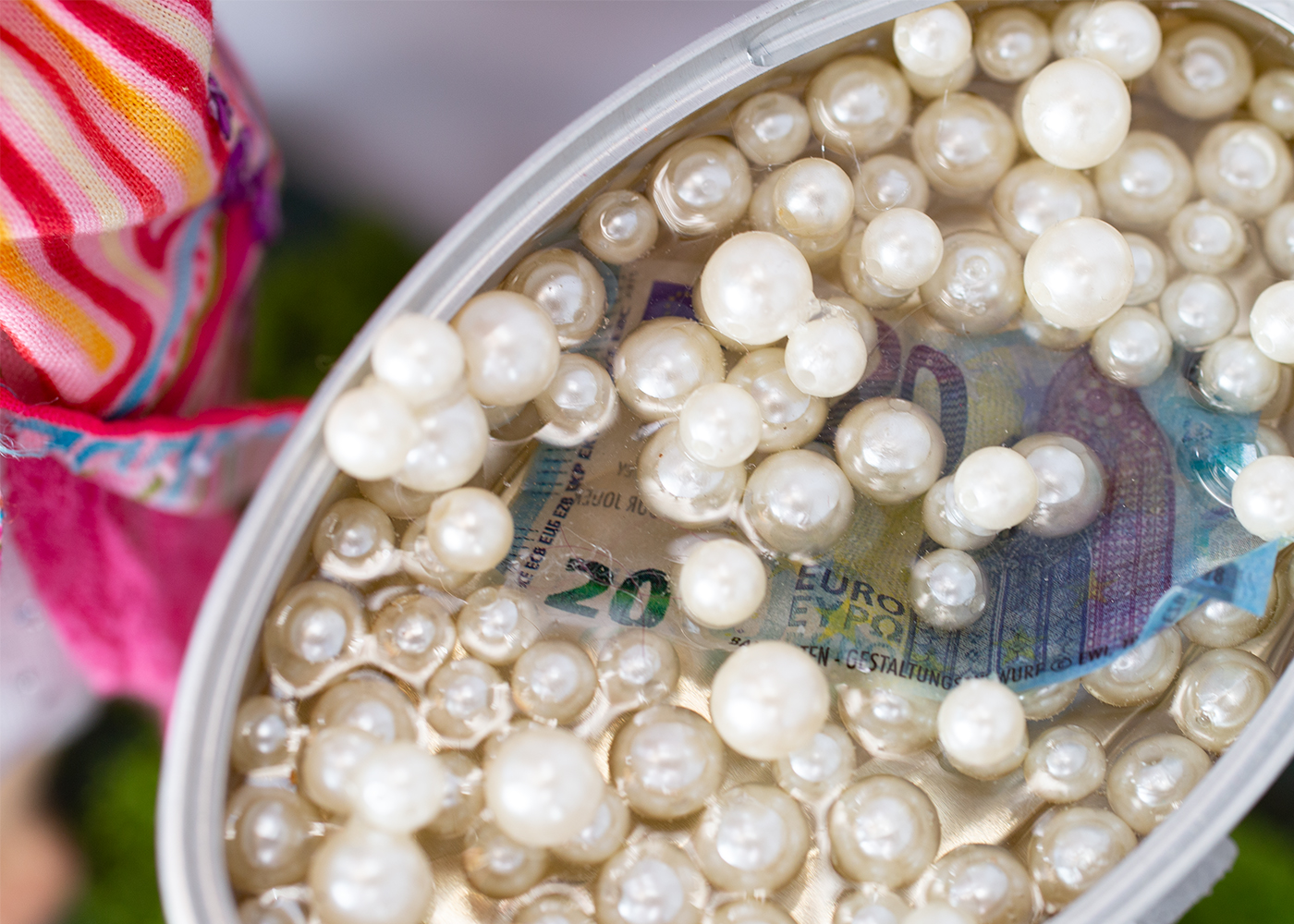 Du möchtest wissen, wie Marie entstanden ist? Marie van Piepen kommt in einem längeren Prozess in dieses Leben. Beamen wir uns zurück ins Jahr 2020. Später Frühling. Wir sind mitten in der Pandemie. Im ersten Lockdown? Oder knapp vorm zweiten? Ich bin mir nicht mehr sicher… Mein Schulprojekt dieser Monate liegt auf Eis, wir hanteln uns online durch die Wochen. Uns Künstlerinnen geht langsam und sicher das Geld, die Piepen, der Flieder aus. Nicht aber die Ideen. Weil ich viel freie Zeit ohne Kundenaufträge habe, schreibe ich wieder Morgenseiten und zeichne mich neugierig in den Tag. Marie fließt eines kreativen Morgens durch meine nichtdominante linke Hand in mein Skizzenbuch. Und dort bleibt sie fast zwei Jahre. Sie spukt immer wieder durch meine Fantasie. Doch dort bleibt sie fürs erste. So elegant wie sie sich jetzt im Jahr 2022 präsentiert ist sie nie gedacht gewesen. Meine Wesen durchleben so gut wie immer Prozesse und Entwicklungen. Vor sechs Wochen meldet sich Marie van Piepen wieder bei mir. Dieses Mal vehement. Allerdings weigert sie sich, in Lockenwicklern und mit Zigarette im Mundwinkel vor Publikum zu erscheinen. Eigentlich wollte sie die Scheine mit der Waschrumpel durchkneten. Auch diesen Plan verwirft sie. Zu kalt. Zu nass ist dieser April. Außerdem war Lockdown kleidungstechnisch eine andere Zeit. Wir einigen uns in vielen Sitzungen und Diskussionen auf die Wäscheleine. Auf ihre wilde, glitzernde Buntheit und jenen Seelenanteil von ihr, der sich gelassen und zuversichtlich durch diese wilde Zeit manövrierte. Ihr süffisantes Lächeln bekomme ich nicht mehr aus ihrem Gesicht. Und ich finde, es steht ihr ganz ausgezeichnet. Allerdings auch dem Tabu-Thema „Geld“.