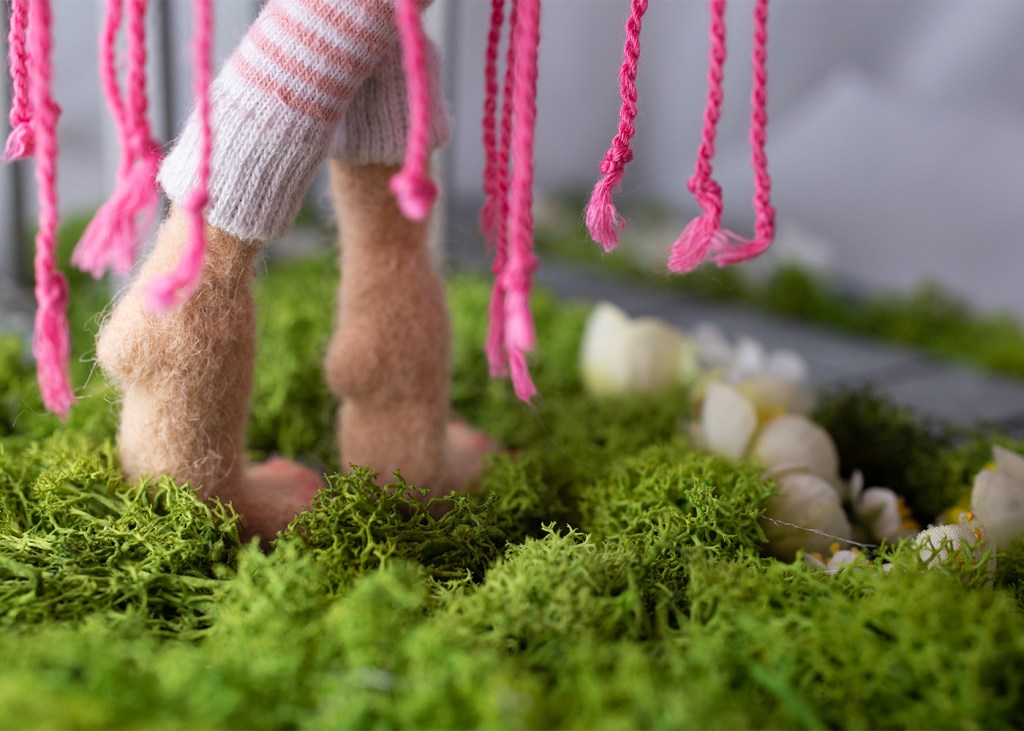 Das Rundherum stellt fast ausschließlich mein Liebster her. Er tüftelt zwei Wochen lang am Wäscheleinenständer und dem Boden. Wir suchen online und direkt in unserer Umgebung nach einem passenden alten Waschbottich und wieder ist es Alexander’s Idee, dass so etwas wie Konservendosen die Lösung sein könnten. Wir essen uns durch den Inhalt einiger Fischdosen, Aufstrichdosen und veganer Brotaufstriche. Und einigen uns auf das ovale Gefäß für den Thunfischaufstrich. Ich schleife einen Nachmittag lang den Werbeaufdruck von der Dose, glätte die Ränder. Währenddessen befasst sich Alexander mit Kunstharz und seiner Zwei-Komponenten-Herstellung. Plastikperlen aus meinem Fundus und ein Zufall im Spielzeugland (wir suchen eigentlich mal wieder einen Waschbottich) vervollständigen die Herstellung des so passendes Bühnenbildes, Marie’s Garten hinter ihrem Haus.