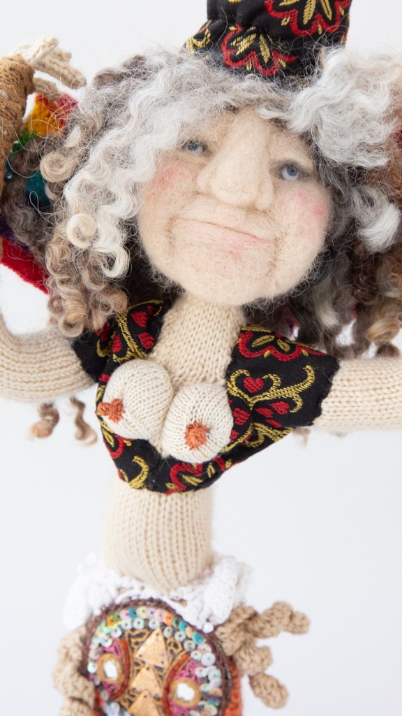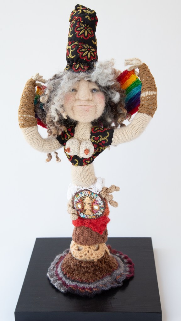 Ich stricke viel in diesen Wochen und Monaten der aufeinanderfolgenden Lockdowns. Es macht mir einerseits Freude, mich mit einer partnerschaftlichen Kultur auf Kreta auseinander zu setzen, die ihre Frauen selbstverständlich wertschätzt. Und andererseits ist es ein Genuss, dass sich dieses Wesen von unten nach oben auf meinen Rundstricknadeln entwickelt. Ich brauche keine Anleitung. Ich lese. Ich schaue mir Bilder an. Meine Finger folgen. Während des Strickens entsteht die Idee und Umsetzung für den nächsten Schritt, die nächste Körperform, die Arme, den Busen. Den Kopf modelliere ich tagelang mit der Filznadel, ich mag auch kein noch so feines gestricktes Maschenmuster im Gesicht haben. Wieder wird die Skulptur eine ältere Frau, gütig und liebevoll und voller Lebensweisheit. Du weißt schon, die Figur schafft an. Ich folge. Ich häkle und stricke und sticke die typischen Spiral- und Kreisformen in den langen Rock. Sie bekommt eine Armatur aus Draht, damit ich sie schwungvoll biegen kann. Mein Mann lebt in den 6oer-Jahren eine Weile in Höhlen auf Kreta. Diese Zeit prägt ihn. Er steuert zu dieser Figur ein wunderbares Schmuckstück von einem kretischen Hippie-Markt bei. Das schöne alte Amulett deutet den Schoßraum meiner Göttin an und ziert ihn auf eine ganz besondere Art. Ich trenne eine sehr alte Borte von einer Jacke und wickle sie zu den typischen Hüten dieser Wesen. Und statt mit Schlangen tanzt meine Göttin mit einer gehäkelten Regenbohnenfahne. Übrigens aus frischen Strängen handgefärbter Wolle meiner Wollfreundin Sandra. Schaut doch mal in ihrem Shop vorbei, ihre leuchtenden Färbungen sind ein Traum!