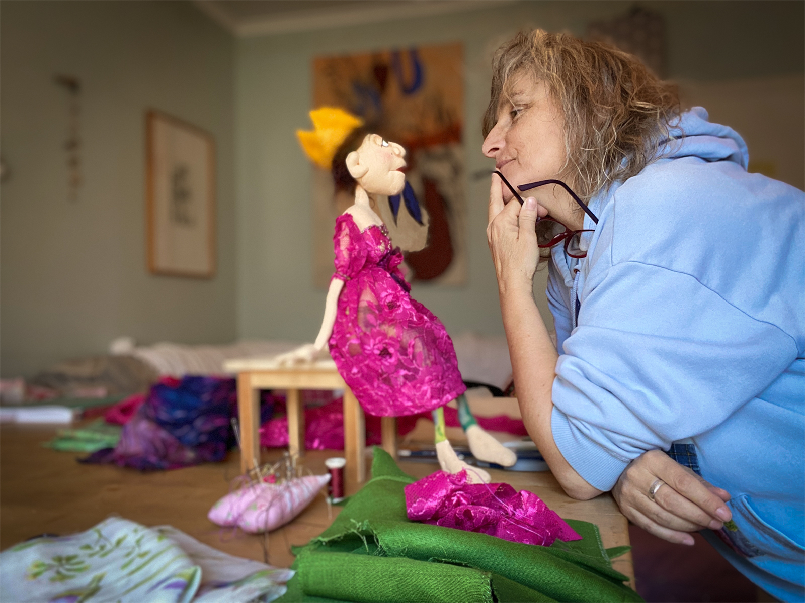Noch einmal zurück zu den Archetypen und den Königinnen. „Karuna die Gütige“ beschäftigt mich den halben Februar und den gesamten März. Dass erst der vierte Kopf und ein Materialwechsel zum gewünschten Ergebnis führt, das kommt vor. Dass diese Wesen sich mit ihren Wünschen (fast) immer bei mir durchsetzen, ist dir als Leserin meines Blogs bekannt. Dieses Mal wird die Kleidung direkt am Körper designt. Was ganz neue Möglichkeiten erschafft. Einerseits passt das königliche Gewand wie angepasst. Und andererseits macht es Freude, Materialien direkt auszuprobieren, zu stecken und händisch zu nähen und sofort zu sehen, in welche Richtung es weitergeht. Wie immer entsteht der nächste Schritt beim Tun. Ich trenne dieses Mal so viel wie noch nie zuvor. Auch ein Zeichen dafür, dass ich viele neue Handgriffe lerne.