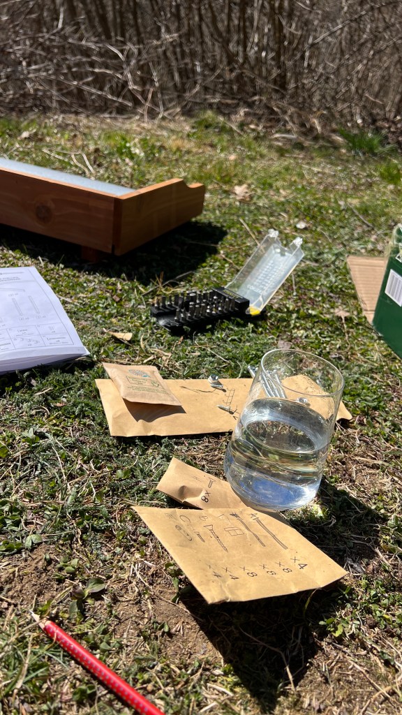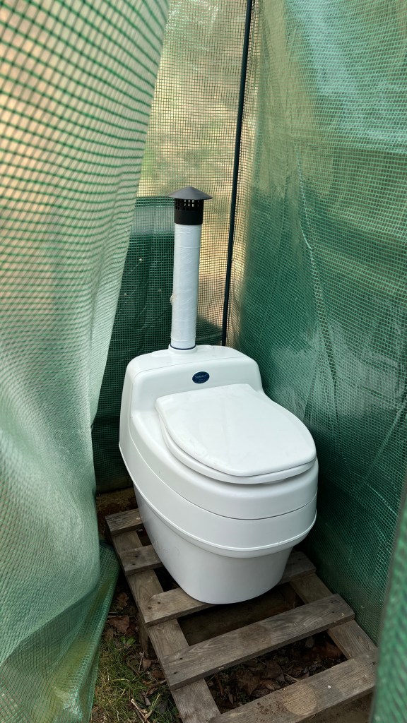 In meinem Kopf spuken aber auch andere Ideen. Ich habe mir vor vier Jahren eine Trocken-Trenn-Toilette für mich gewünscht. Und auch bekommen. Bis jetzt war nicht die Zeit, sie zu installieren. Das öffentliche Camping-Platz-Badehaus hat auch gereicht. Als ich darüber nachdenke, wo dieser Luxus heuer hinkommt, fällt mir das Tomatenhaus ein, das wir vergangenes Jahr angeschafft haben. Was, wenn wir direkt an das Tomatenhaus das Baugerüst anschließen, idealerweise gleich an den Zirkuswagen gelehnt? Und was, wenn ich die Trocken-Trenn-Toilette direkt dort hinein installiere?