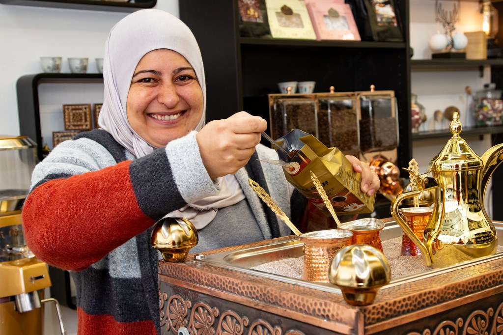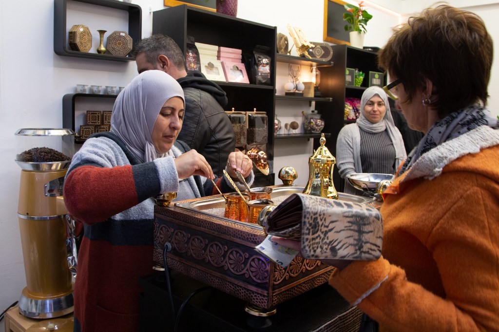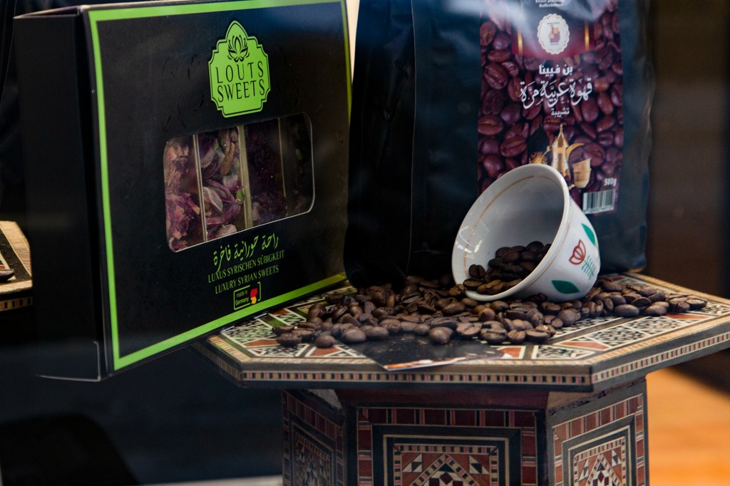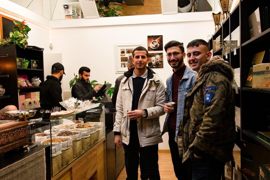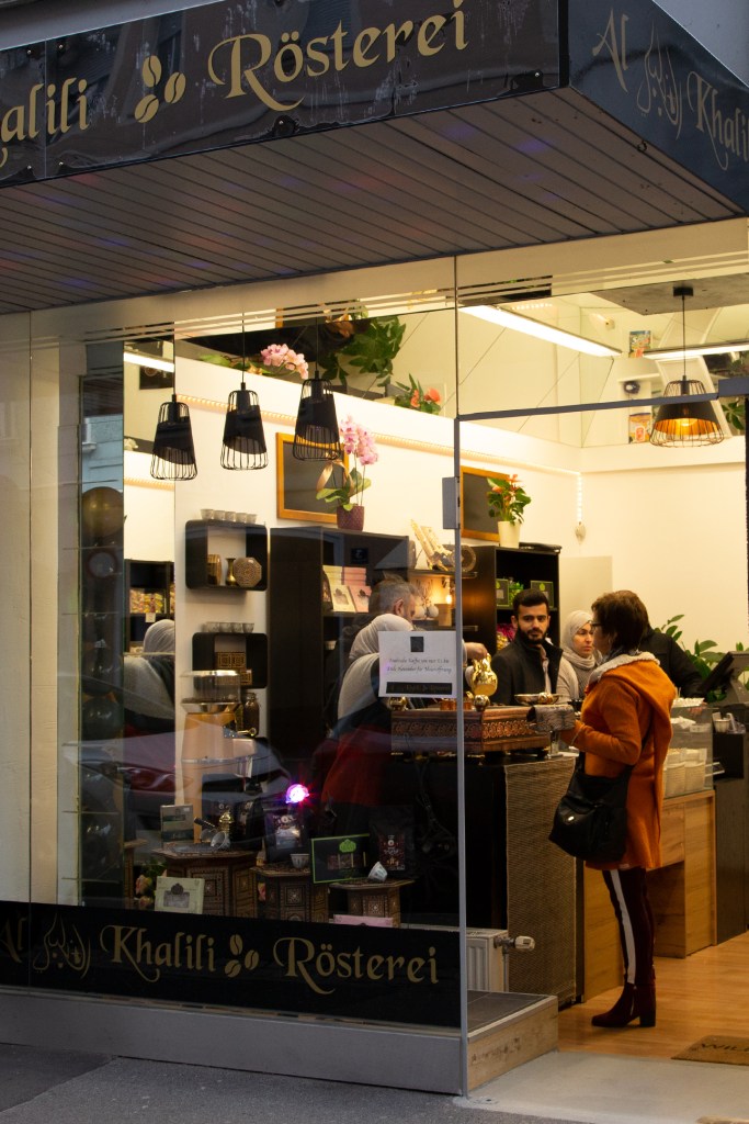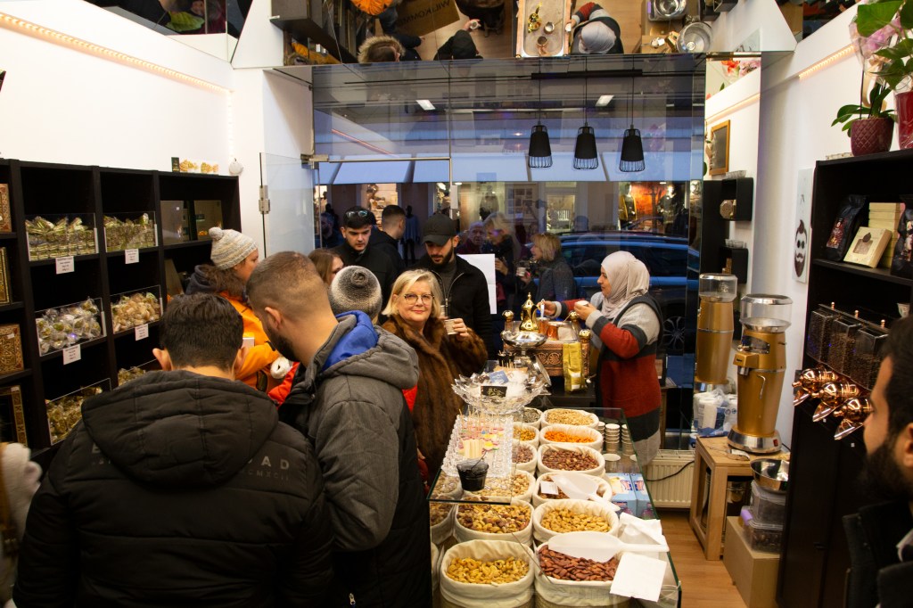 Als ich gestern mit Charlotte, einer Freundin aus dieser Zeit des Ehreamtes, bei Adnan, Lamis und ihren Söhnen in der nagelneu eröffneten arabischen Rösterei in der Villacher Postgasse stehe, fühle ich, dass die so oft gehörten Geschichten über den erfolgreichen Unternehmer aus Dar’a in Syrien wahr sind. Adnan ist in seinem Element, checkt, organisiert, lädt ein, bietet selbstbewusst sein Wissen und seine Produkte an. Er ist ganz Unternehmer, ganz Gentlemen. Nun endlich auch in Österreich. Seine Frau sprüht und funkelt vor Leben, kocht unermüdlich arabischen Kaffee im mit Sand gefüllten Heizbecken, dessen Fachname ich nicht kenne. Nein, das ist keine alte Tradition, sondern so ziemlich das Aktuellste, das die arabische Kultur anbietet, erklärt mir Adnan. Der Quarzsand speichert die Hitze der Kochplatte des Beckens. Die Spiegel an der Decke reflektieren die luxuriös anmutende Einrichtung in Schwarz, Gold und Weiß. Es duftet nach Kaffee, Nüssen – und Süßem. Mit von der Partie ist nämlich der Süßwarenhersteller und Schwager Aiman, der wunderbares arabisches Konfekt in Deutschland fertigen lässt. Erst jetzt kapiere ich, dass ich dieses Konfekt schon im Deutschkurs in Pöckstein genossen habe! Und das es nicht ein Geschenk aus irgendeinem Duty Free Laden war, sondern immer schon aus der Familie kam. Wäre der Krieg nicht gewesen, würde es immer noch in Syrien produziert und im angrenzenden arabischen Raum verkauft werden! Sehr schnell finde ich gestern eine optische und kulinarische Sensation aus Rosenblättern, Pistazien und Granatapfelkernen. Ja, die rosenwasserduftenden Köstlichkeiten sind wunderschön, köstlich und ein tolles Geschenk. Dieses Hellgrün-Magenta-Rot mit dem süß-sauren orientalischen Geschmack erobert allerdings mein Herz im Sturm und ich stelle mich gern hinter den anderen Käufer*innen an. Weihnachten ist schon erstaunlich nahe, gell?