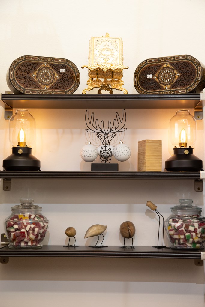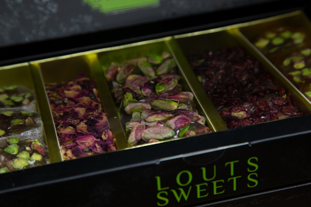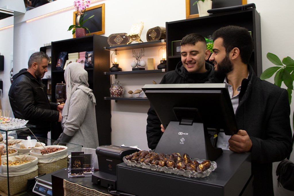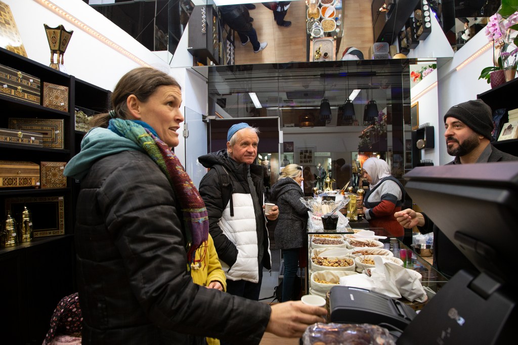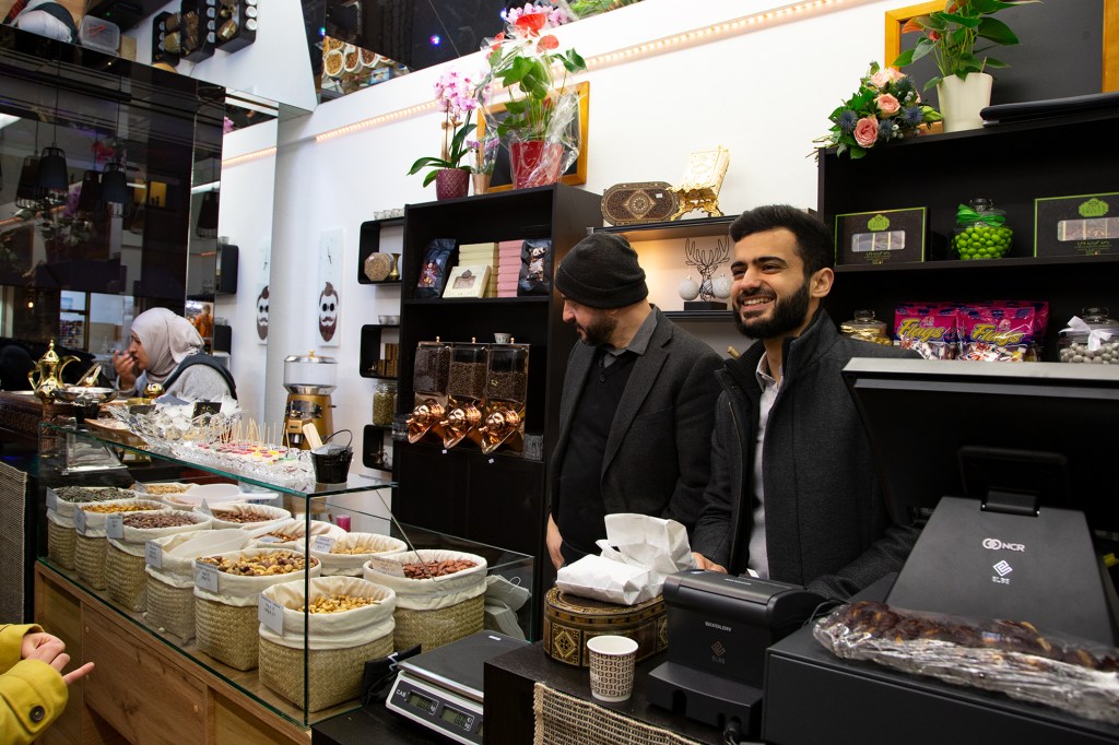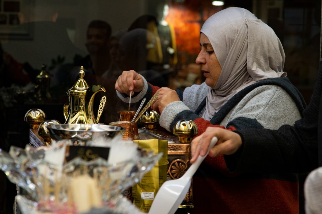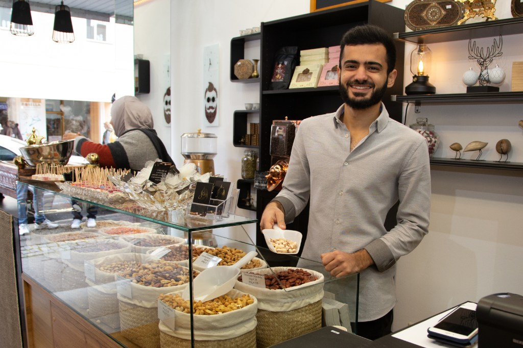 Als ich gestern mit Charlotte, einer Freundin aus dieser Zeit des Ehreamtes, bei Adnan, Lamis und ihren Söhnen in der nagelneu eröffneten arabischen Rösterei in der Villacher Postgasse stehe, fühle ich, dass die so oft gehörten Geschichten über den erfolgreichen Unternehmer aus Dar’a in Syrien wahr sind. Adnan ist in seinem Element, checkt, organisiert, lädt ein, bietet selbstbewusst sein Wissen und seine Produkte an. Er ist ganz Unternehmer, ganz Gentlemen. Nun endlich auch in Österreich. Seine Frau sprüht und funkelt vor Leben, kocht unermüdlich arabischen Kaffee im mit Sand gefüllten Heizbecken, dessen Fachname ich nicht kenne. Nein, das ist keine alte Tradition, sondern so ziemlich das Aktuellste, das die arabische Kultur anbietet, erklärt mir Adnan. Der Quarzsand speichert die Hitze der Kochplatte des Beckens. Die Spiegel an der Decke reflektieren die luxuriös anmutende Einrichtung in Schwarz, Gold und Weiß. Es duftet nach Kaffee, Nüssen – und Süßem. Mit von der Partie ist nämlich der Süßwarenhersteller und Schwager Aiman, der wunderbares arabisches Konfekt in Deutschland fertigen lässt. Erst jetzt kapiere ich, dass ich dieses Konfekt schon im Deutschkurs in Pöckstein genossen habe! Und das es nicht ein Geschenk aus irgendeinem Duty Free Laden war, sondern immer schon aus der Familie kam. Wäre der Krieg nicht gewesen, würde es immer noch in Syrien produziert und im angrenzenden arabischen Raum verkauft werden! Sehr schnell finde ich gestern eine optische und kulinarische Sensation aus Rosenblättern, Pistazien und Granatapfelkernen. Ja, die rosenwasserduftenden Köstlichkeiten sind wunderschön, köstlich und ein tolles Geschenk. Dieses Hellgrün-Magenta-Rot mit dem süß-sauren orientalischen Geschmack erobert allerdings mein Herz im Sturm und ich stelle mich gern hinter den anderen Käufer*innen an. Weihnachten ist schon erstaunlich nahe, gell?