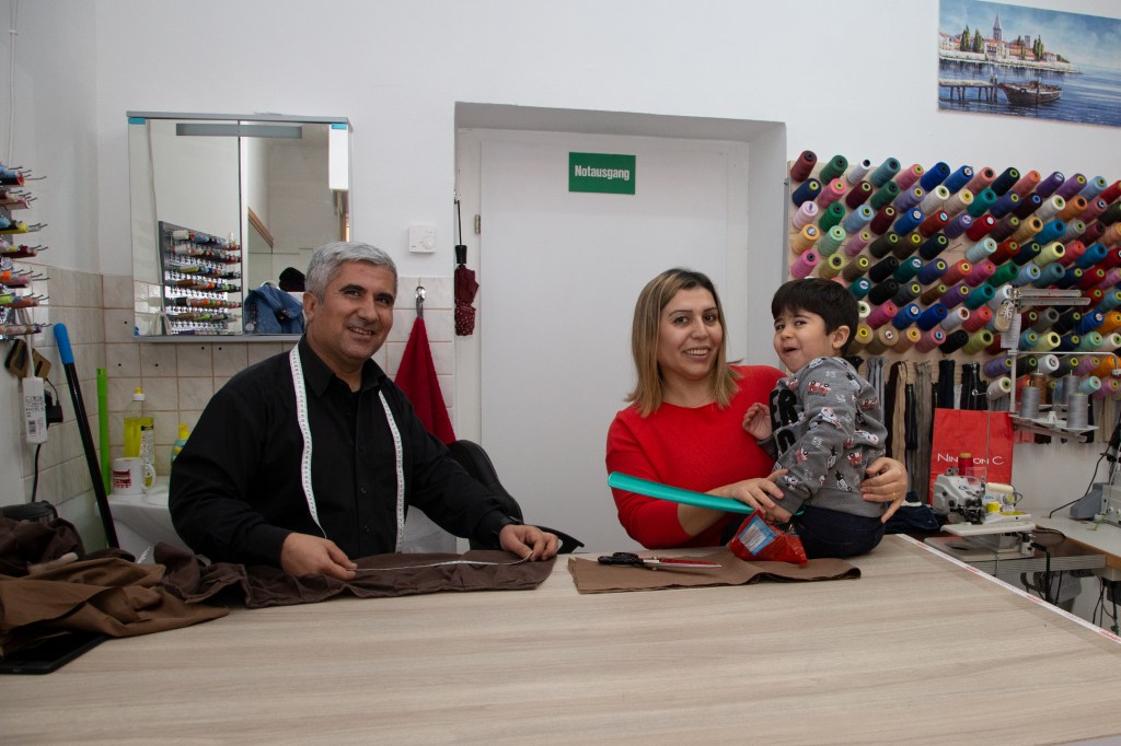 Während wir arabischen Kaffee mit Cardamom verkosten, winkt mir vis à vis aus dem hellerleuchteten Schaufenster eine junge Frau zu. Sie kommt mir vage bekannt vor. Adnan lacht. Ja, ich sehe richtig! Das ist Azima! Die zweite Familie aus Pöckstein, die mit ihren Kindern Tür an Tür mit unseren Freunden wohnte und mit uns Deutsch lernte. Ich fasse es nicht! Die „Änderungsschneiderei Rosella“ besteht seit genau einem Monat und wird vom Schneidermeister Aref und Azima geleitet! Lachend umarmen wir uns. Wie immer gibt es schwarzen Tee und Azima’s Kuchen – Ausreden werden ignoriert. Wir aktualisieren unsere Kontaktinfos und reden und lachen. Der kleine Ivan, der mir noch als Baby in Erinnerung ist, lächelt mich schüchtern an.