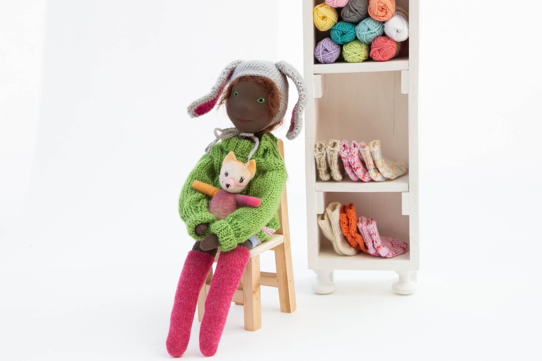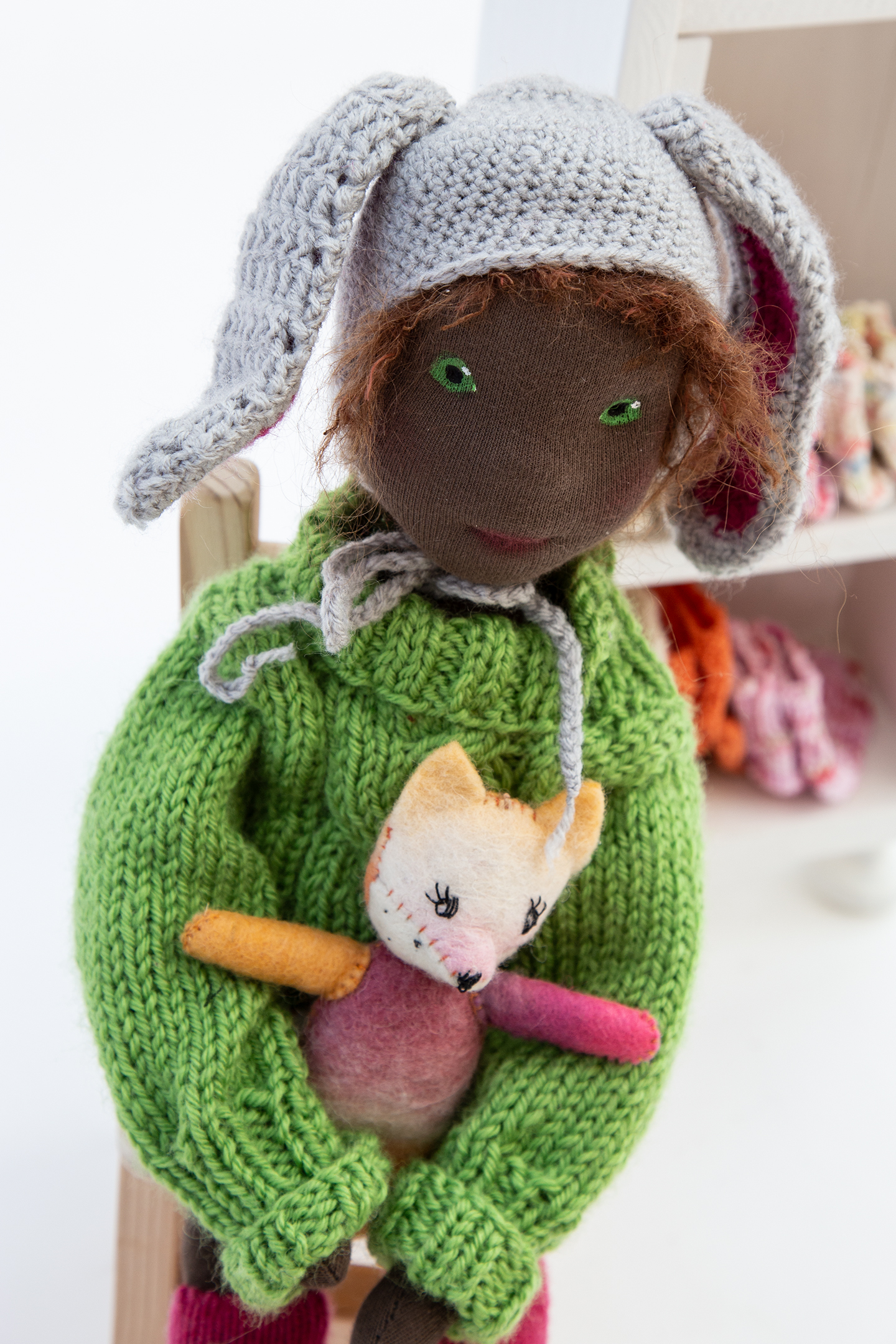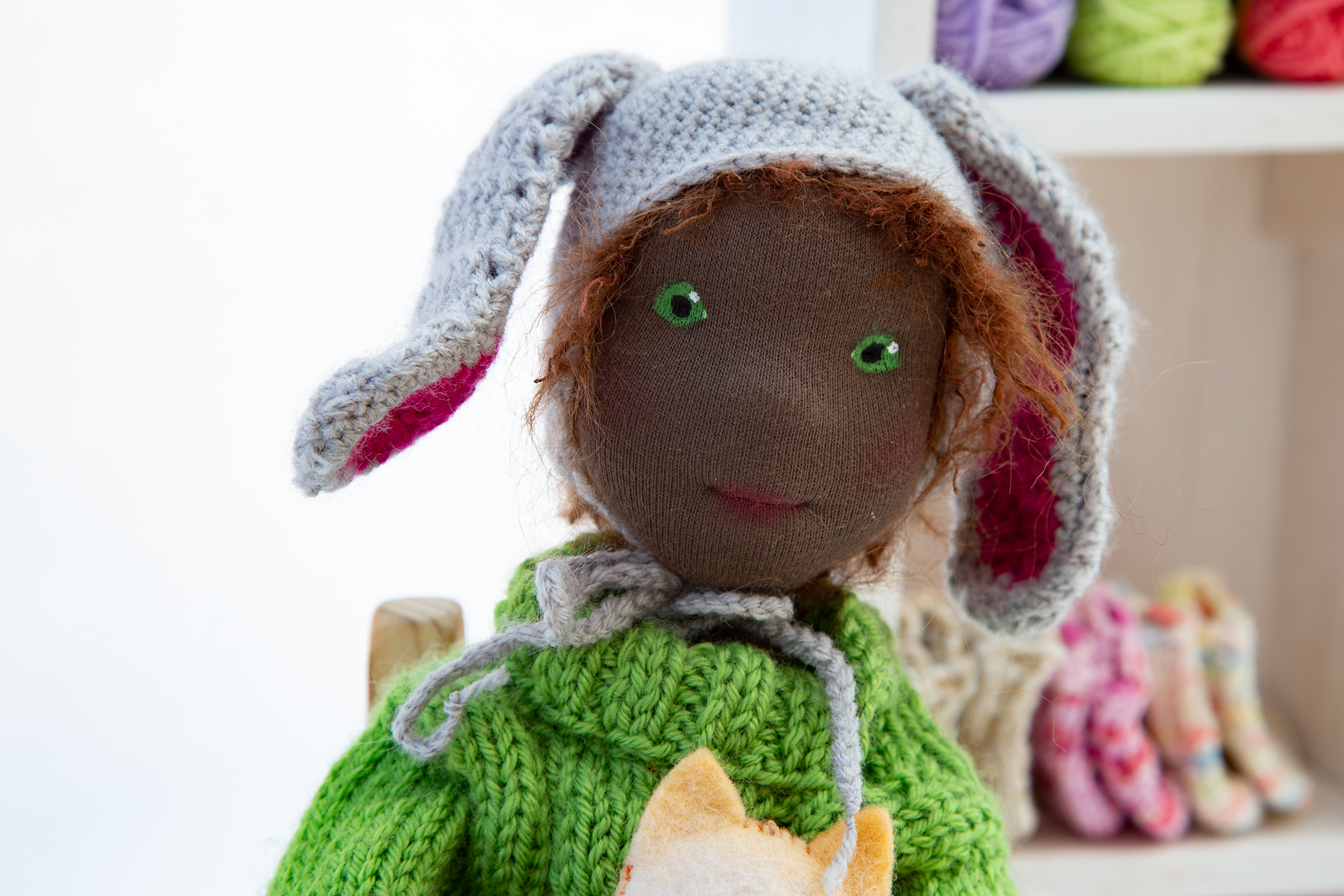 Franzi ist nach ihrem Aufenthalt im Klagenfurter Gemeinwohlladen wochenlang im Studio um mich herumgeschlichen. Hat um eine Osterhasenmütze gebettelt. Das musste sie. Es war einfach sowas von nicht auf meinem Plan. Aber nun gut, ihr kennt das ja schon. Der Mensch denkt. Die Puppe lenkt. Franzi kann ausnahmsweise sitzen. Ansonsten fällt sie in die Kategorie der einfachen Stoffpuppen. Wer ihr tief in die grünen Augen schaut sieht, dass sie nicht einfach ist. Sie ist liebenswürdig. Aber nicht einfach.