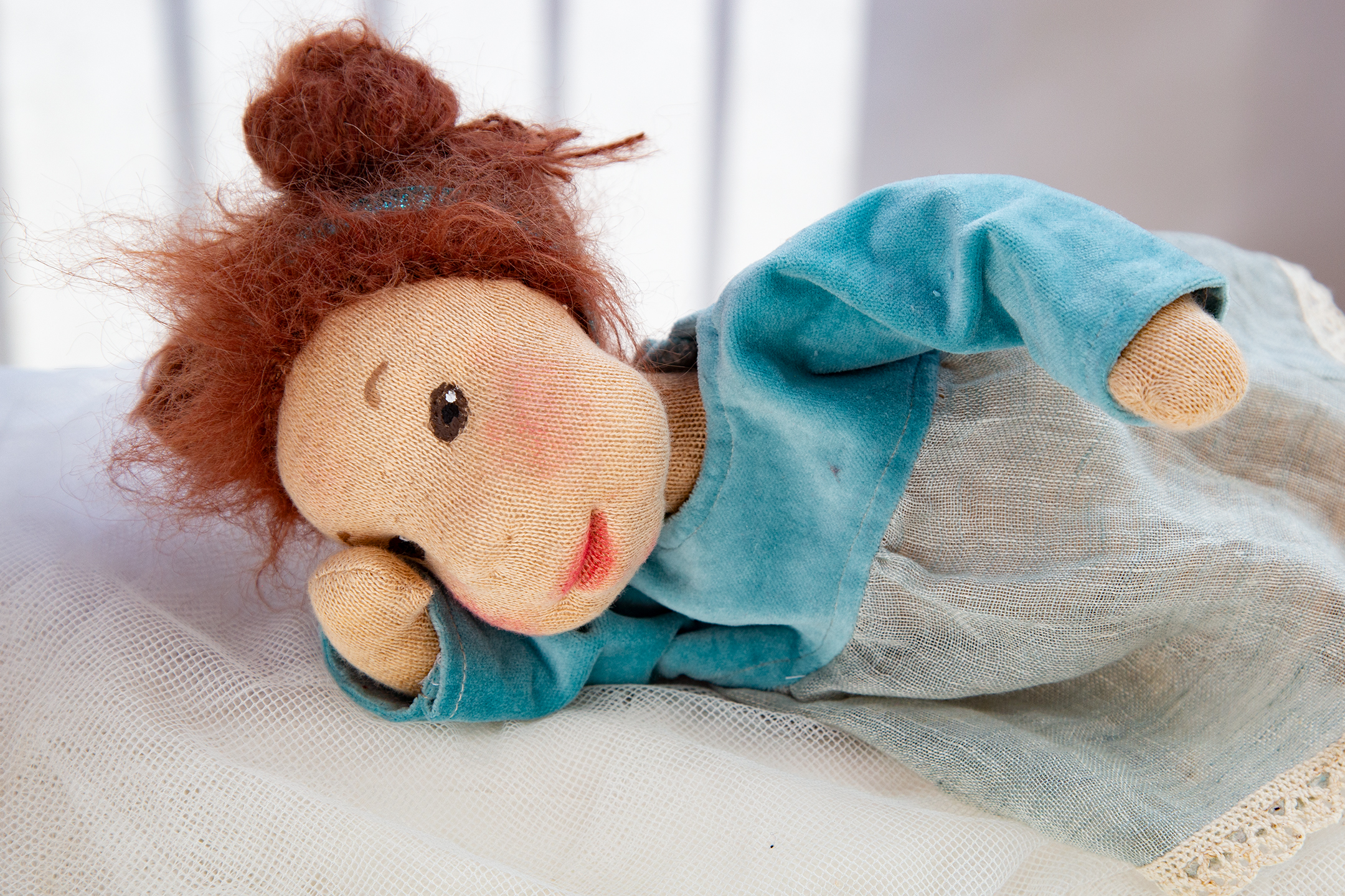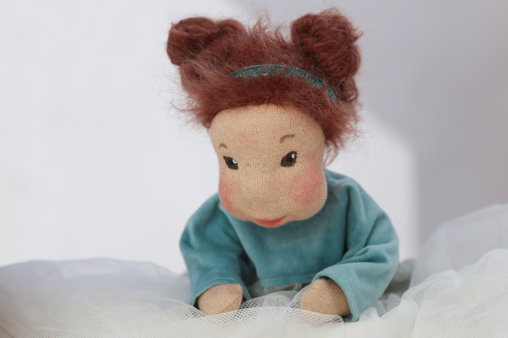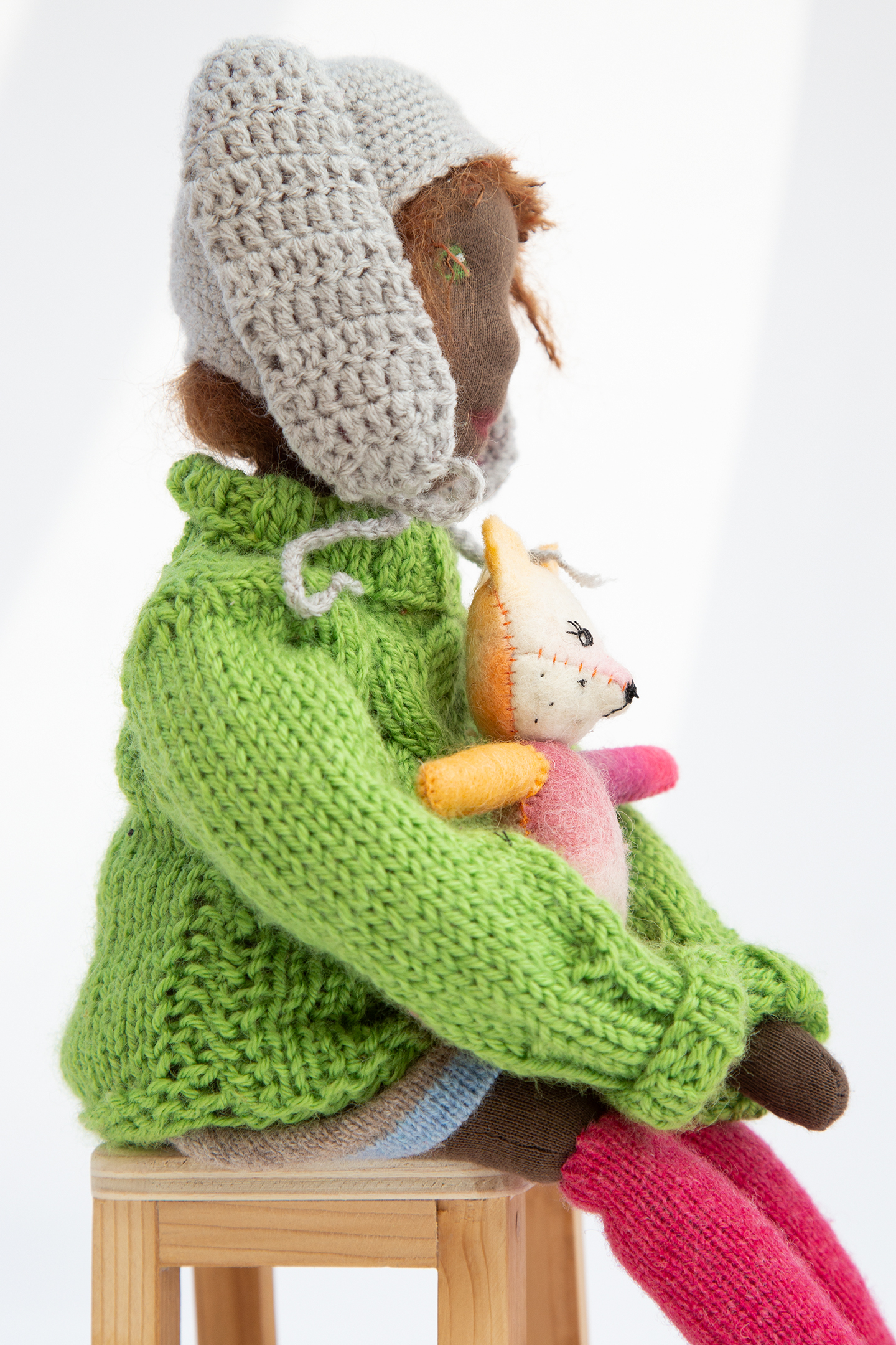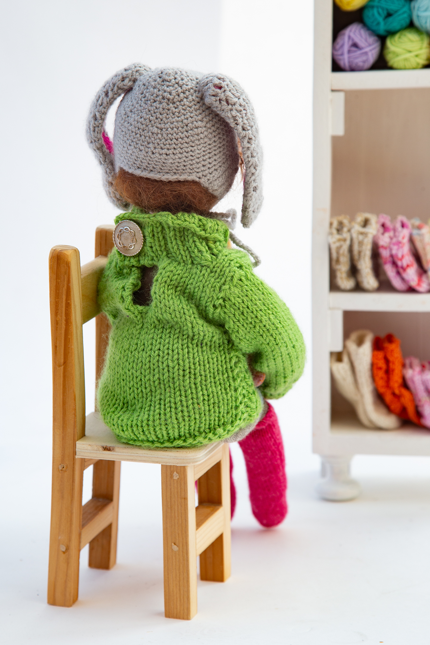 Franzi ist nach ihrem Aufenthalt im Klagenfurter Gemeinwohlladen wochenlang im Studio um mich herumgeschlichen. Hat um eine Osterhasenmütze gebettelt. Das musste sie. Es war einfach sowas von nicht auf meinem Plan. Aber nun gut, ihr kennt das ja schon. Der Mensch denkt. Die Puppe lenkt. Franzi kann ausnahmsweise sitzen. Ansonsten fällt sie in die Kategorie der einfachen Stoffpuppen. Wer ihr tief in die grünen Augen schaut sieht, dass sie nicht einfach ist. Sie ist liebenswürdig. Aber nicht einfach.
