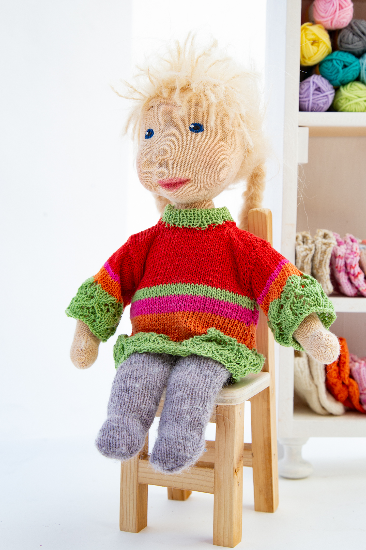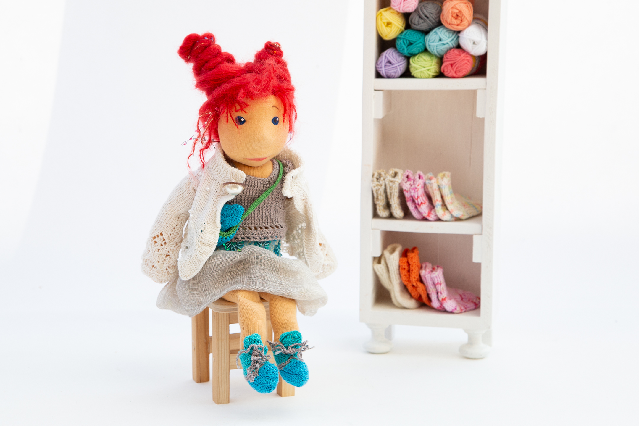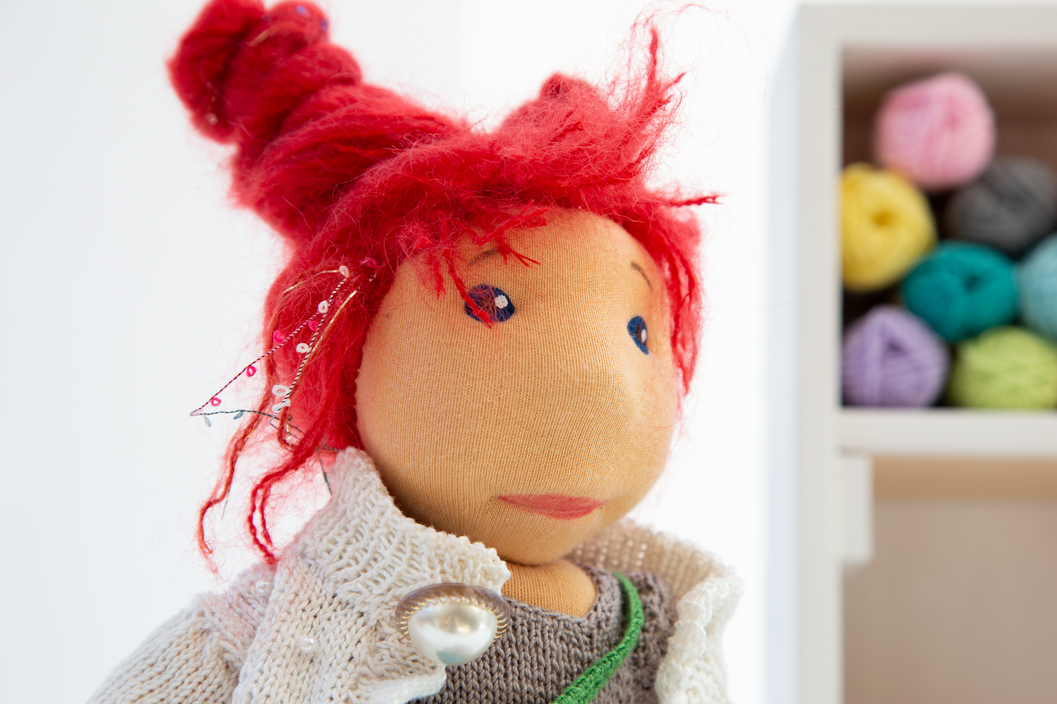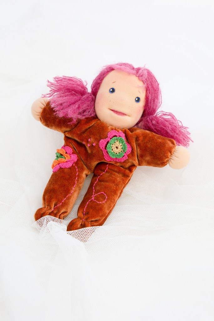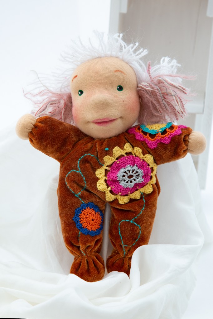 Mira ist eines der Wesen, das mich seit einem halben Jahr zu Kursen begleitete und vielen zukünftigen Puppenmacherinnen zeigte, wie so einer Zauberwesen aussehen kann. Sie trägt einen Pullover in meinen absoluten Lieblingsfarben, den Farben der dreifärbigen Bougainvillea und ist überhaupt ein Sonnenschein.
