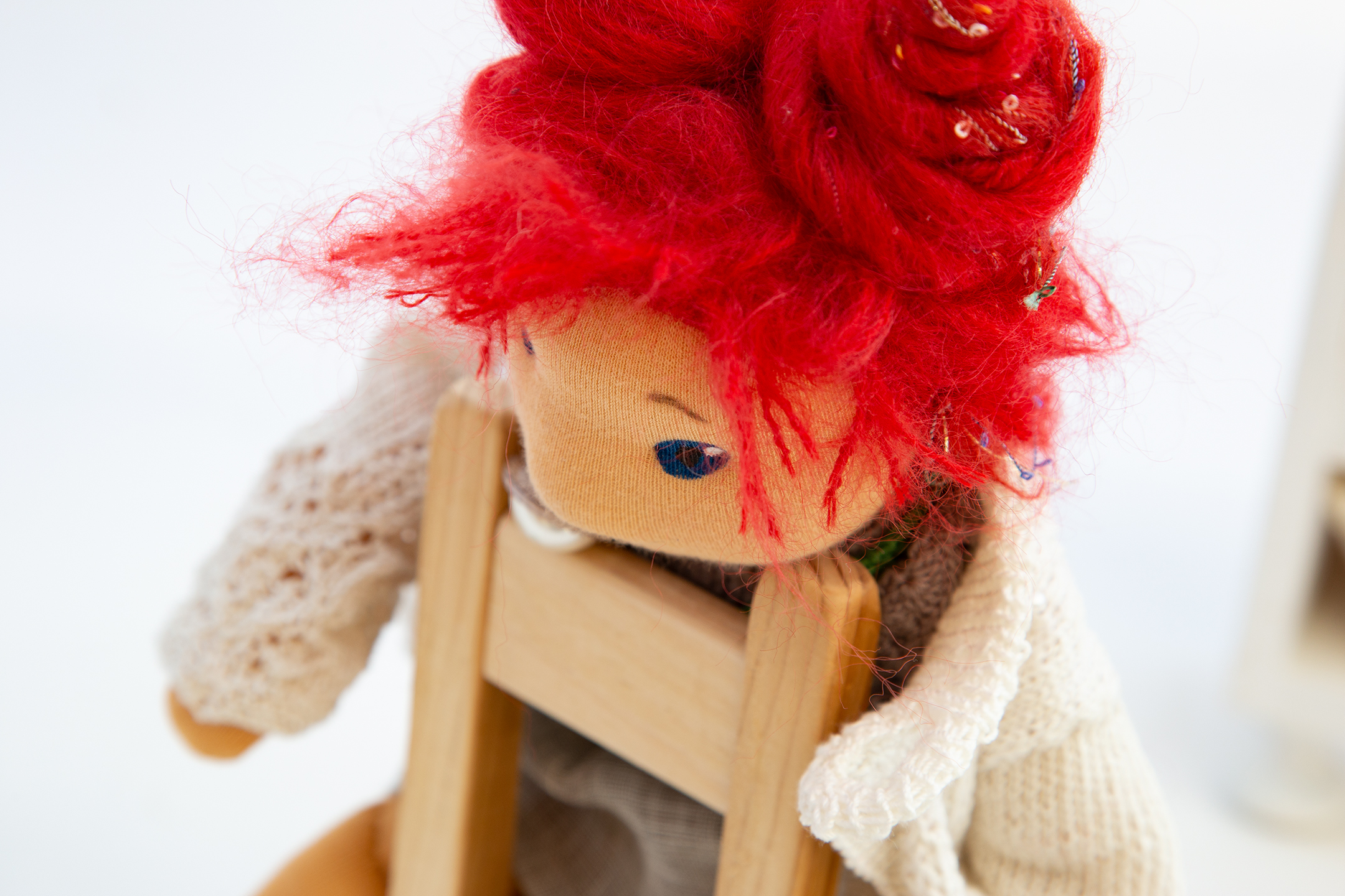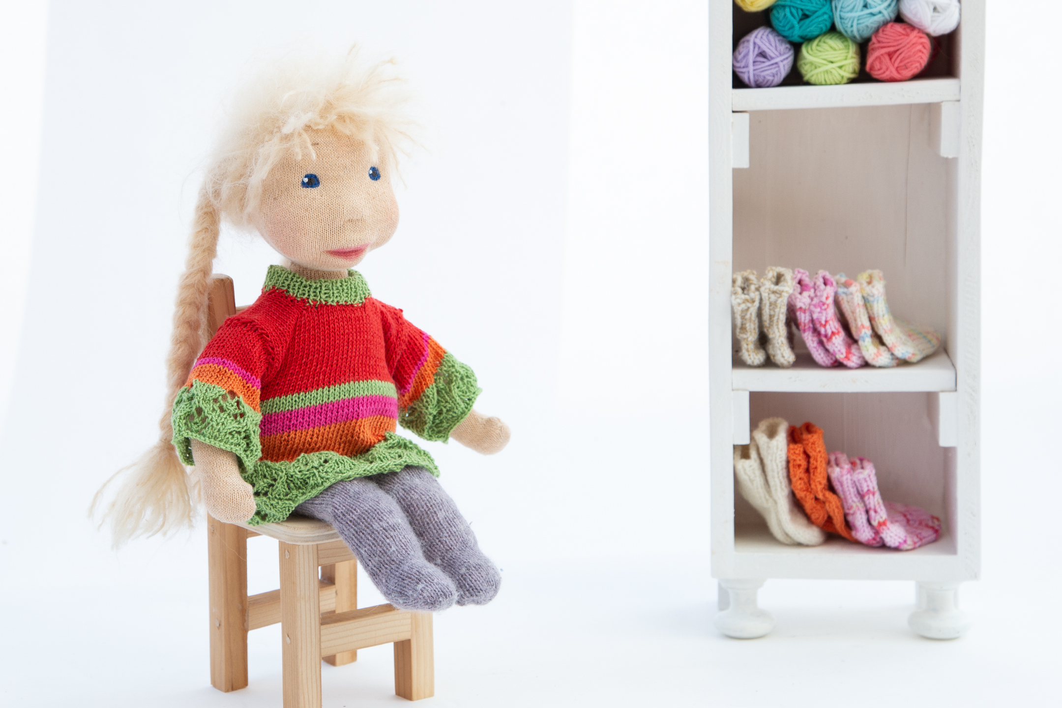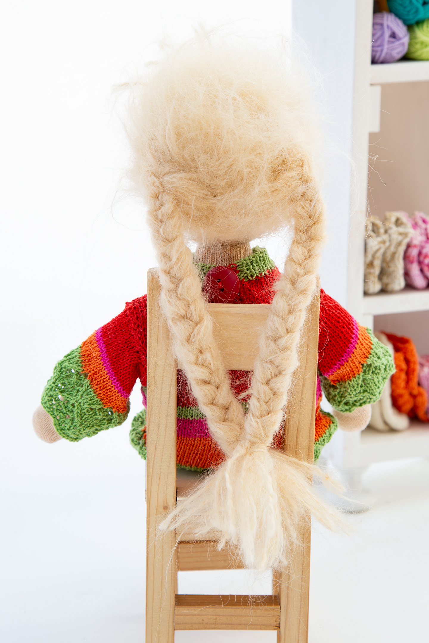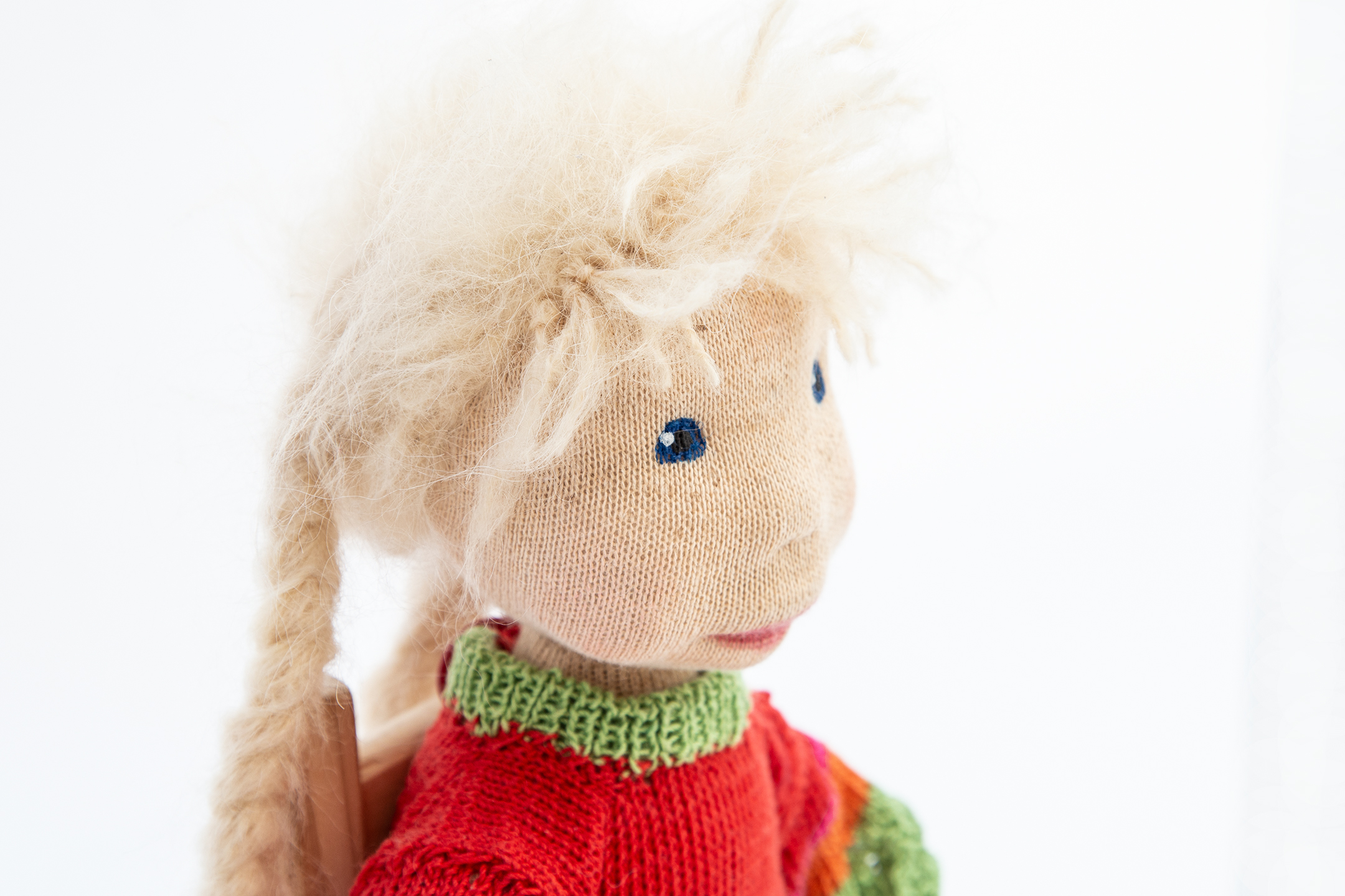 Mira ist eines der Wesen, das mich seit einem halben Jahr zu Kursen begleitete und vielen zukünftigen Puppenmacherinnen zeigte, wie so einer Zauberwesen aussehen kann. Sie trägt einen Pullover in meinen absoluten Lieblingsfarben, den Farben der dreifärbigen Bougainvillea und ist überhaupt ein Sonnenschein.