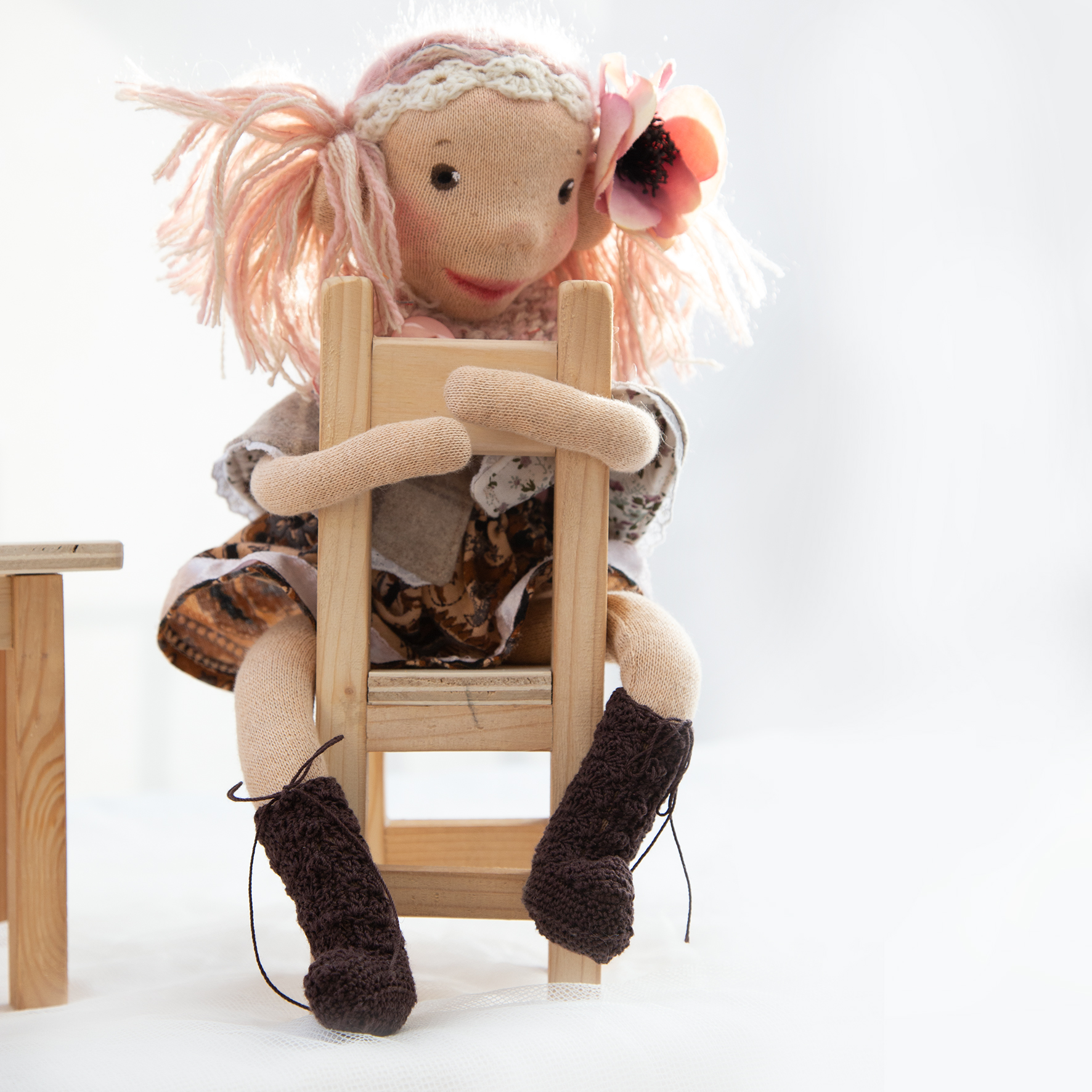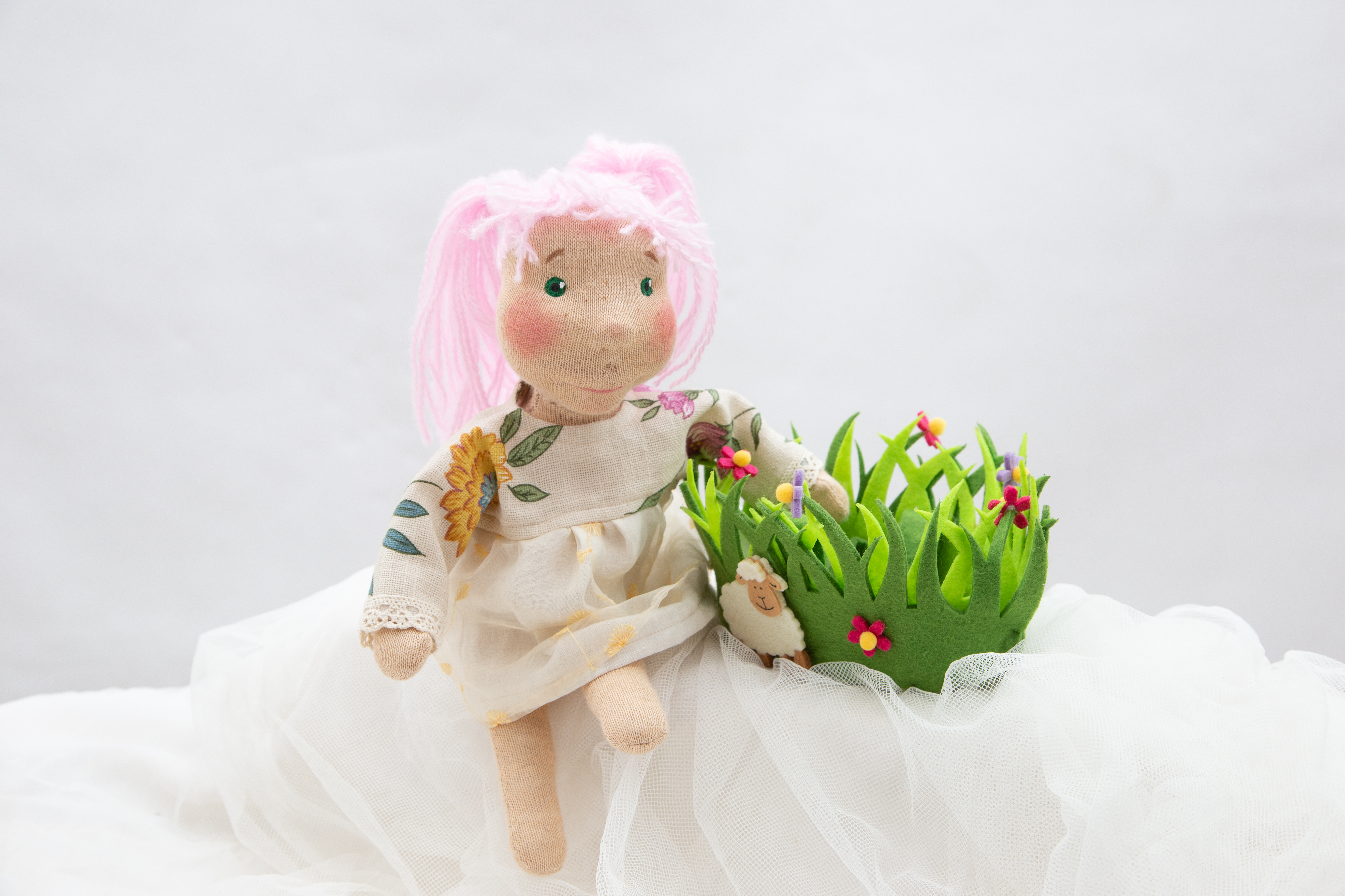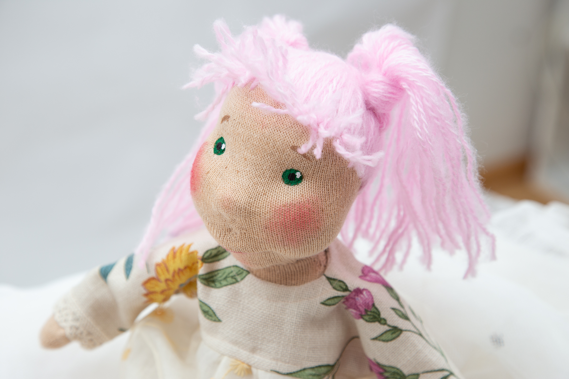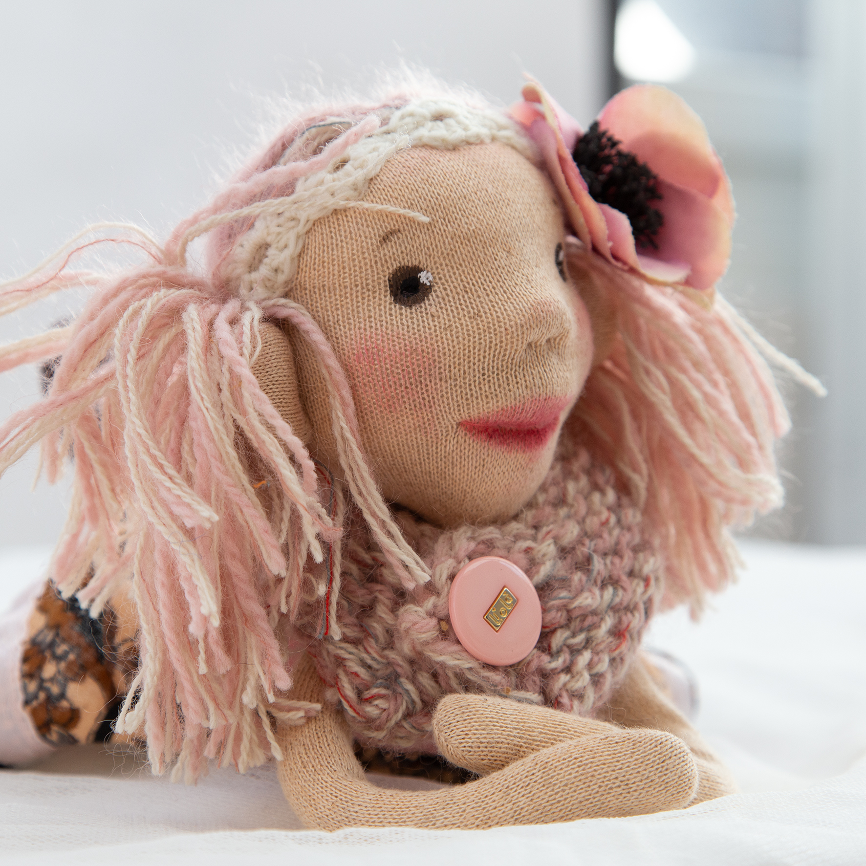 Allegra Handliche Stoffpuppe aus Naturmaterialien, handgemacht, eigenes Design geboren am 9. März 2019 in Stoberdorf/Österreich